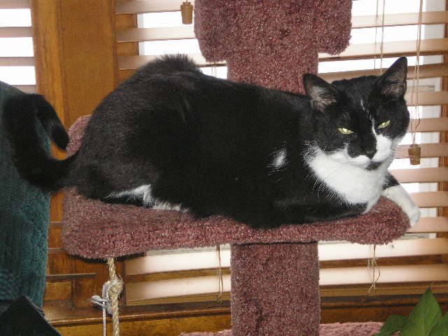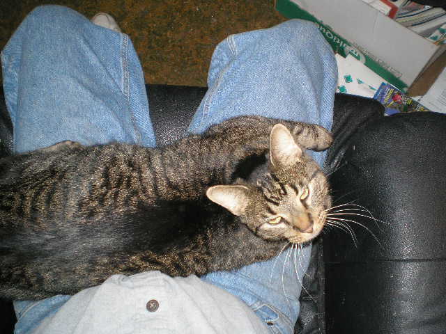 Our cats, all rescue cases. Pair in the chair, Murphey is the black and white, with Callie. I found Murphey in a snow bank in the median of a hiway in Feb. 8 years ago, almost dead, half frozen, been run over, broken hip. Vet guessed him to be about 12-14 weeks old at the time. Hoover on my lap. He is the biggest and about 1 1/2 years old. I am not a little person at 6 foot even and 218 lbs., and he takes up a lot of my lap. And Sammy the retarded cat. Really. He keeps us on our toes.
