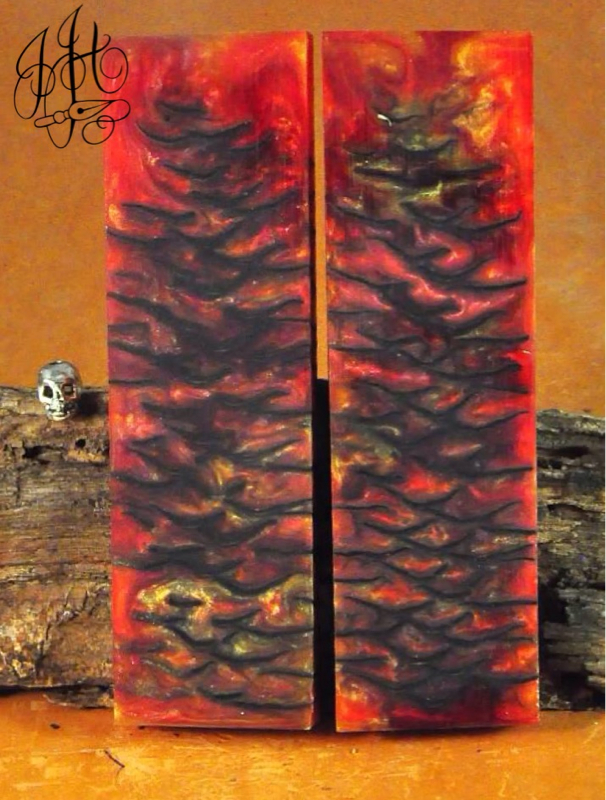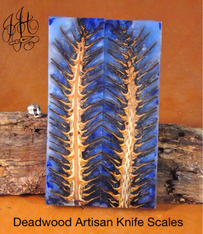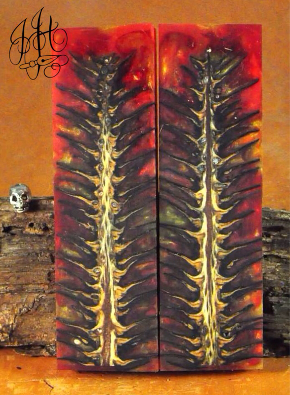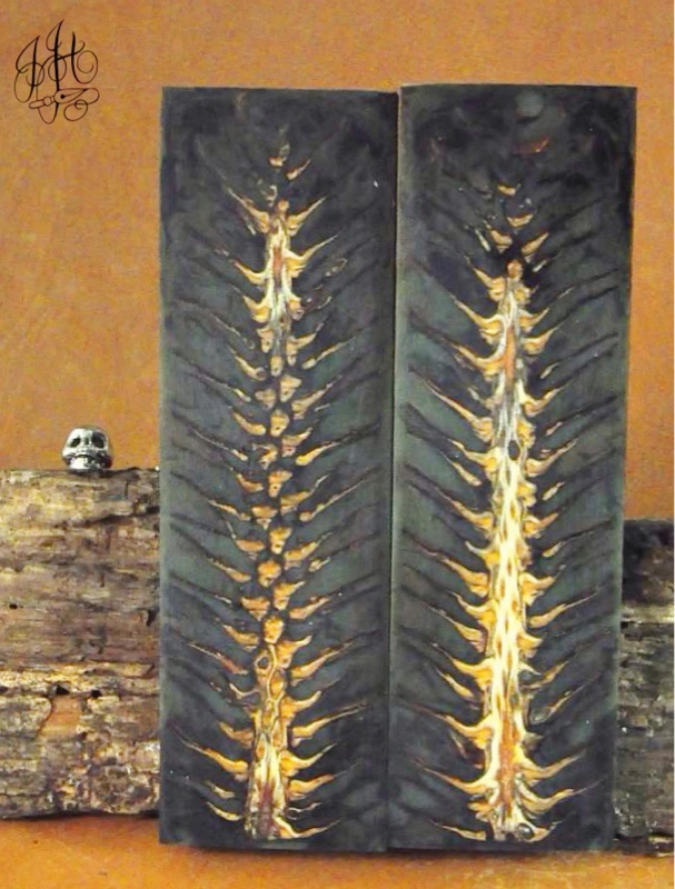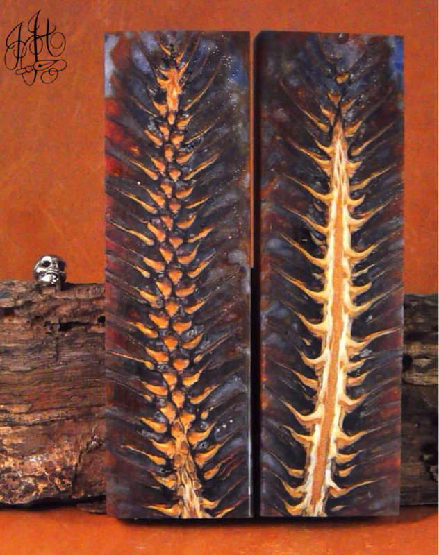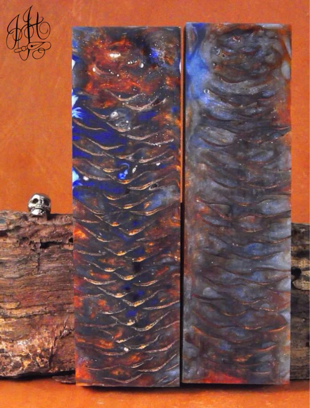 Tim; Those are fantastic !! I have never seen something so unique and beautiful in a knife scale before. You should have no trouble selling whatever you make. I have two questions. Are these four sets all from two single casts with each one cut in half, thus giving you both inside and outside of the cones. And, could you make matching scales that would show either two inside or two outside cones, making both sides of the knife bookmatch ?? Jim S
