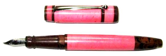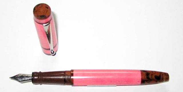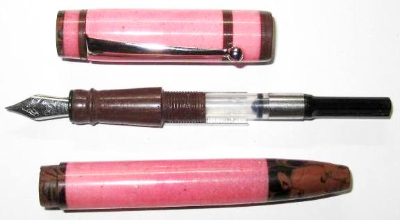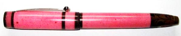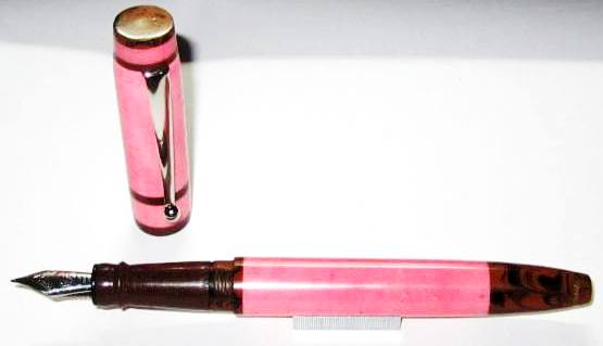A fully kit-less pen made from one of those balnks. For strength I have used poly-resin tube inside so the large pen is barely 20.5 gms in weight. Schmidt size 5 nib with a modified Jinhao converter. Section is brown ebonite and trim rings and end finials are left over ebonite stumps. Developing the technique to use up my own cast blanks. The cap is snap type fit.