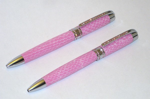 This is a couple of PSI Princess pens with pink crystals and pink leather blank. It was one requested by a lady Harley rider. Since the pen takes two differens size blanks (8mm on the body and 10mm on the cap), you need to buy one of each but they make two pens.