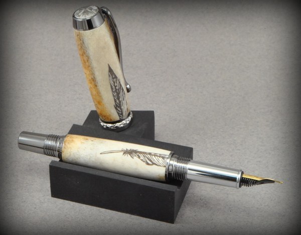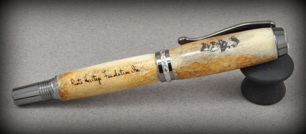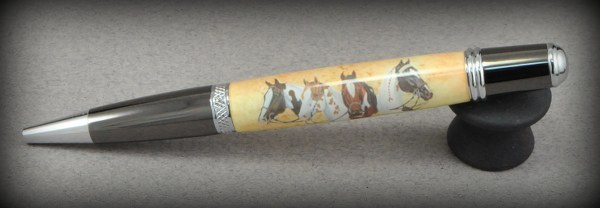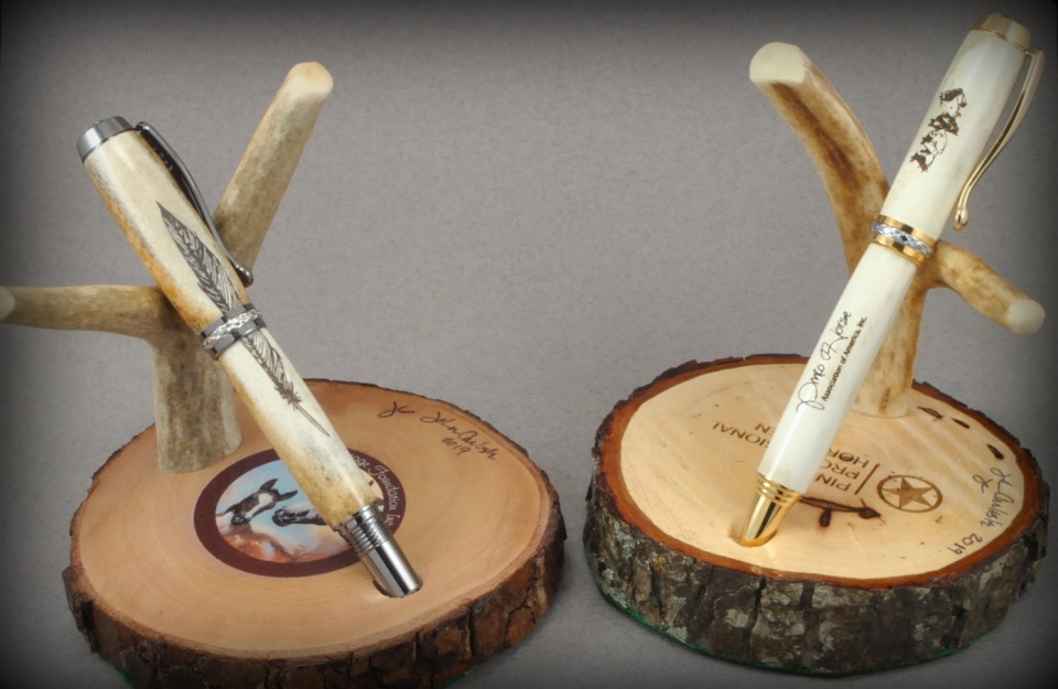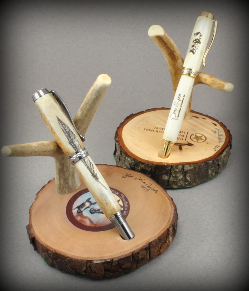 This is my 5th year commission from a master judge with the Pinto Horse Assoc. of America. These pens will be auctioned for their youth riding programs. All are in deer antler, all have laser engraving of various Pinto Associations. One stand is laser engraved, and one is done with uv ink application. Fountain pen, ballpoints. One of last years pens went for over $1,000.