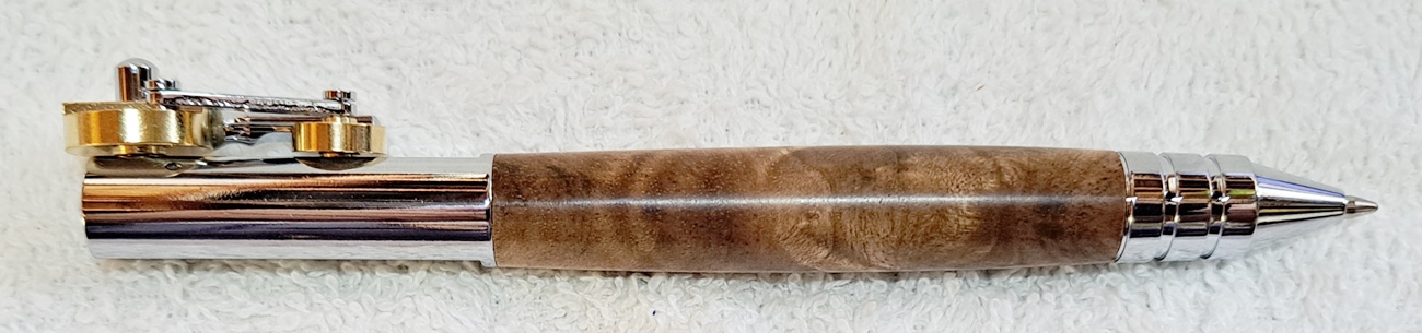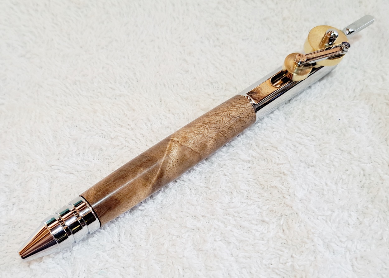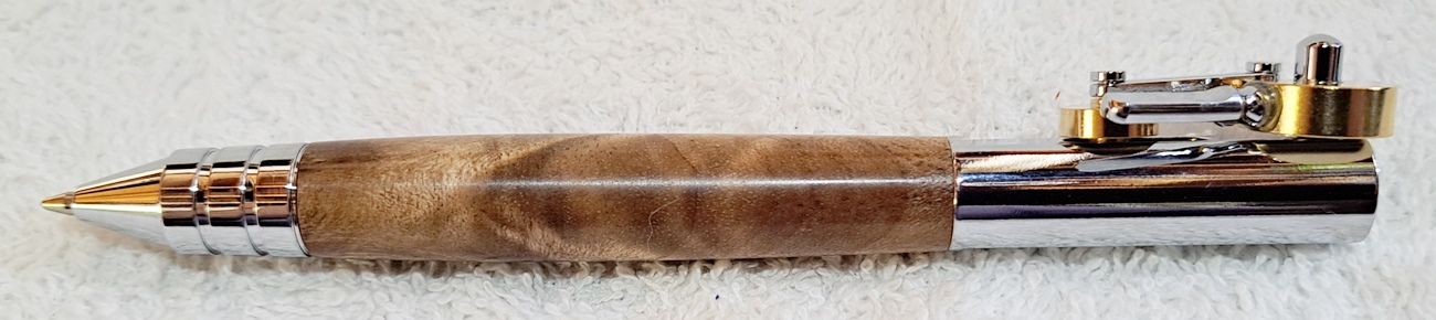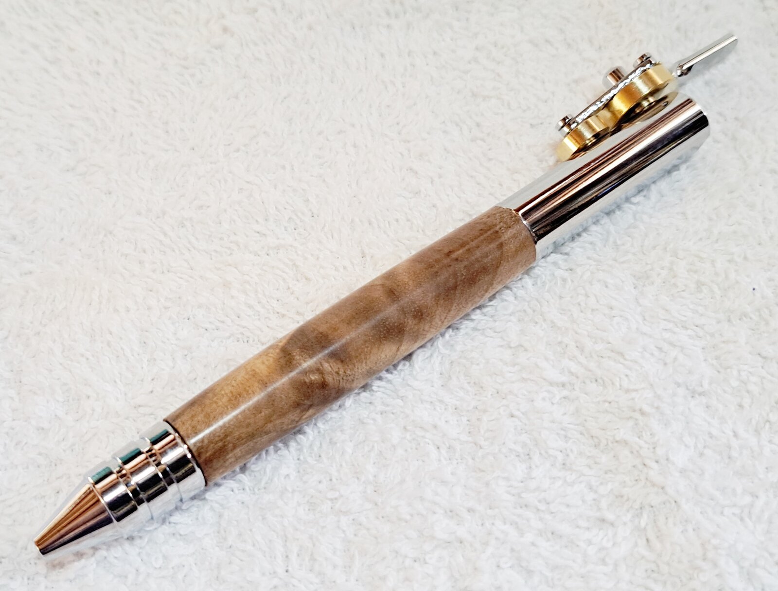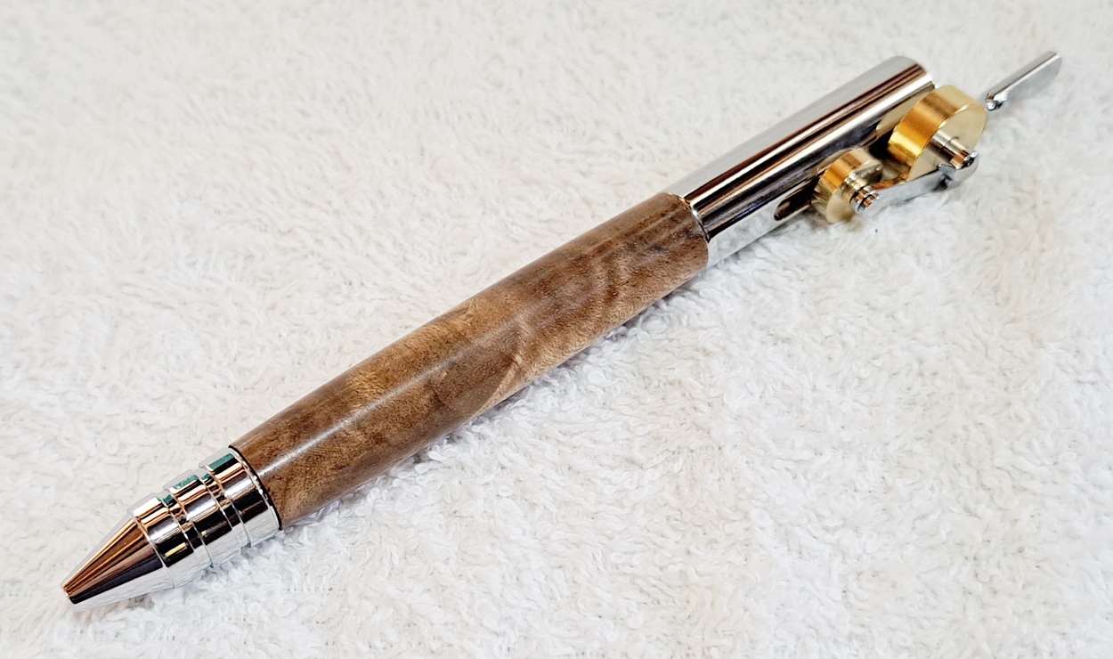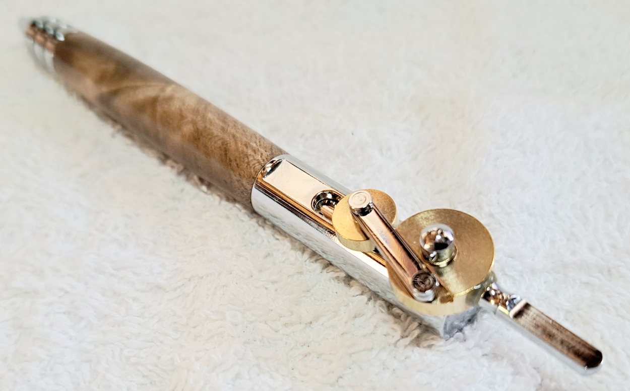 This is one of the new Piston kits from PSI, in chrome and brass. It's kind of weird, and I don't know if I like it. The lever is straight up when the refill is retracted, and down when it's extended. But my daughter-in-law loved it, so I'm going to engrave it for her. The wood is another spectacular piece of black walnut from Dennis' father-in-law. The finish is Mylands and carnuba wax.