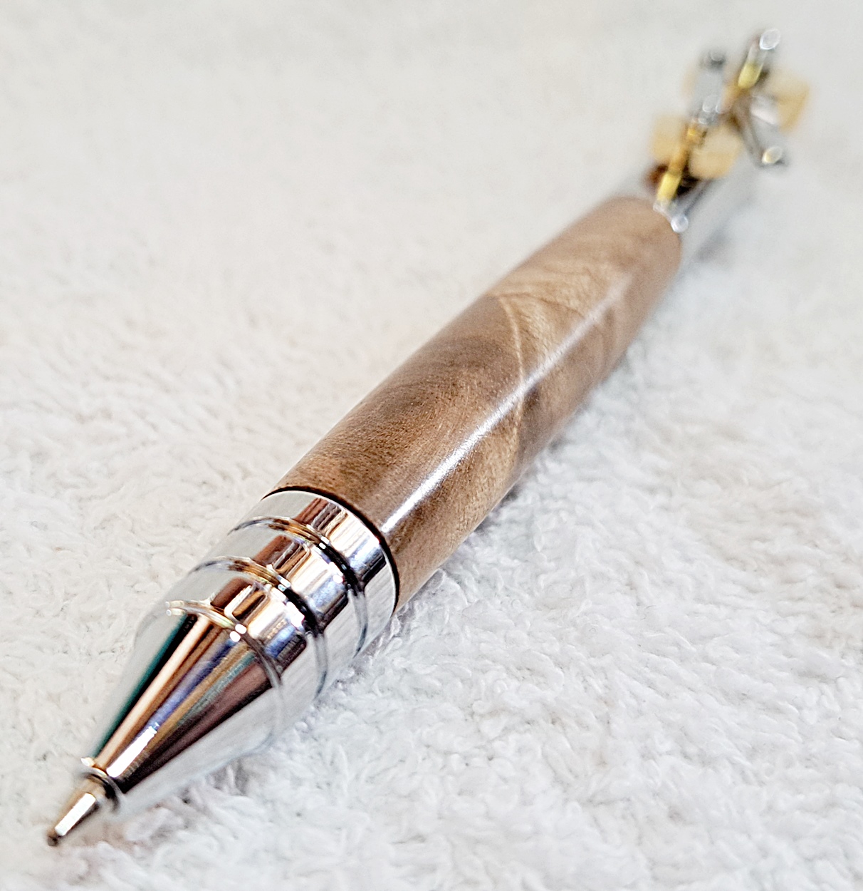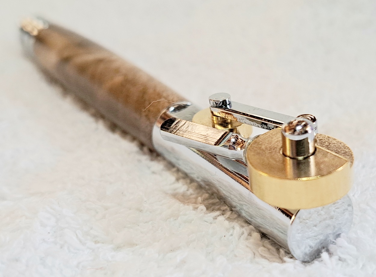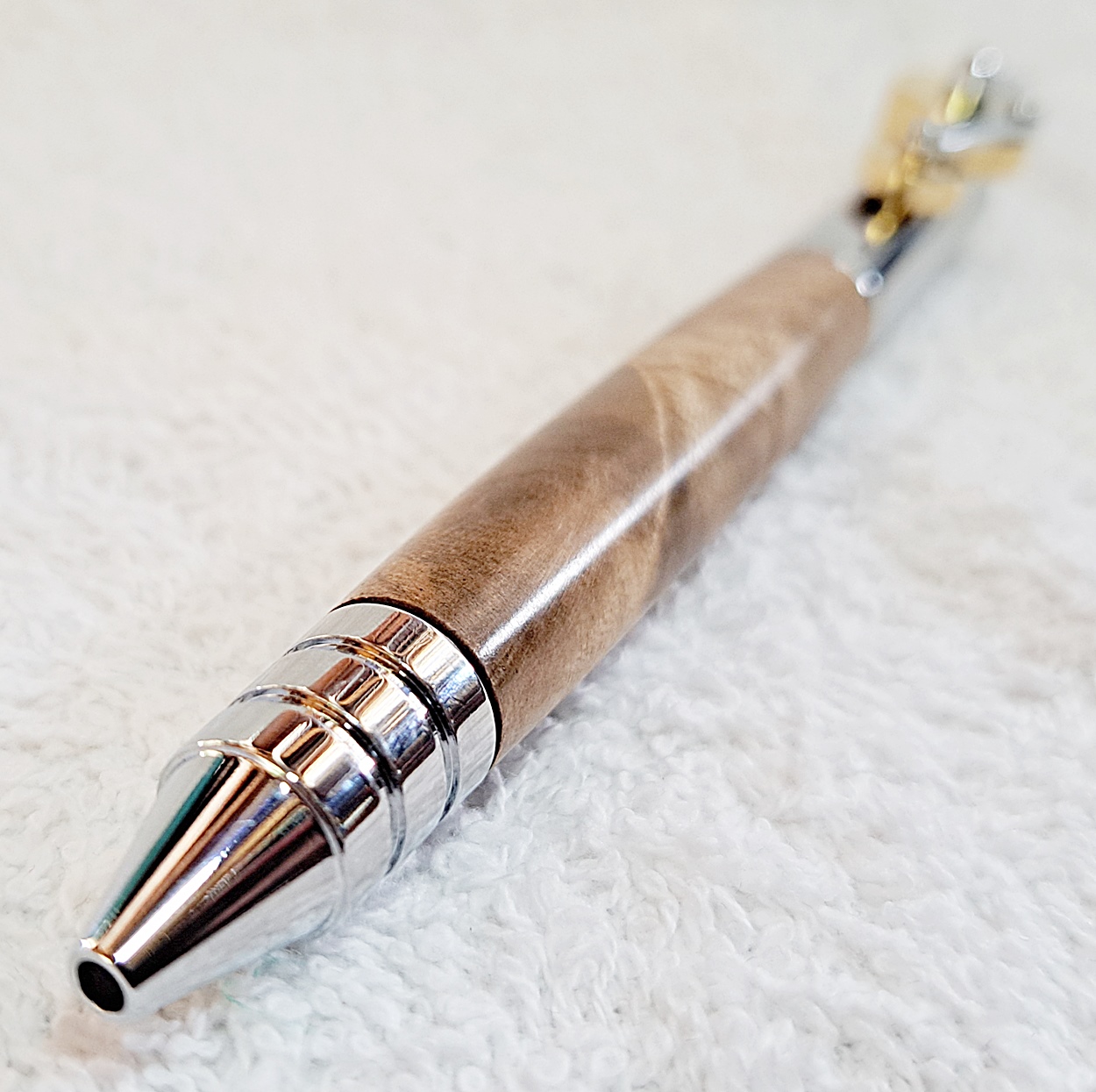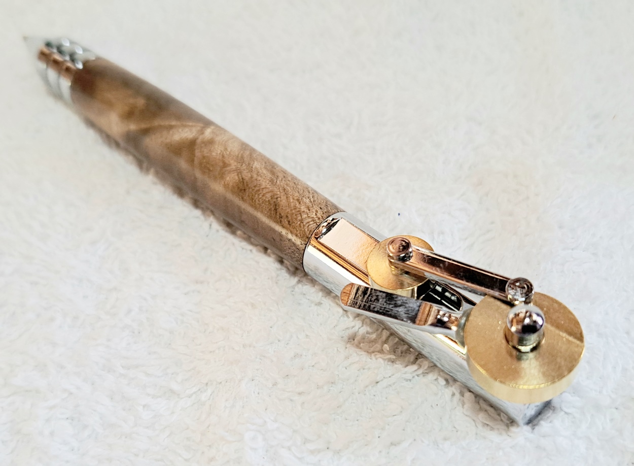 This is one of the new Piston kits from PSI, in chrome and brass. It's kind of weird, and I don't know if I like it. The lever is straight up when the refill is retracted, and down when it's extended. But my daughter-in-law loved it, so I'm going to engrave it for her. The wood is another spectacular piece of black walnut from Dennis' father-in-law. The finish is Mylands and carnuba wax.