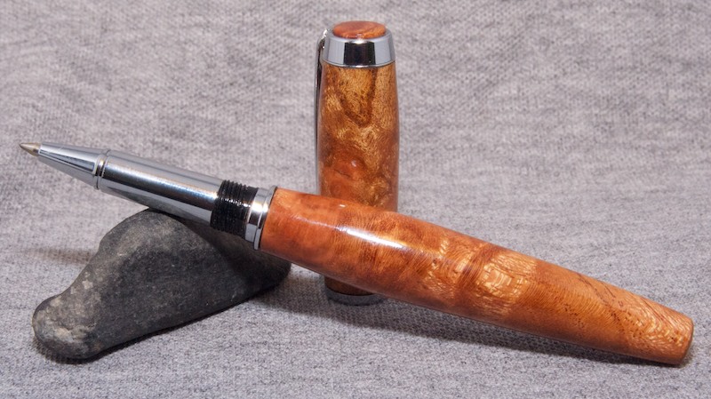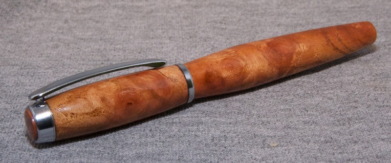 The pen is a Jr Gent I closed end in White Cedar Burl (Melia azedarach) and the finish is three coats of dipped poly. Don't let my crappy flash burned pic fool you, it has a nice even glossy finish... even with my diffuser I couldn't get a picture without some flash burn. The wood has incredible detail that was very difficult to pick up and it really dances as you move the pen around... Incredible! I've included a Brooks-esque close up shot to give you all an idea of the figure this blank has! It's really awesome!