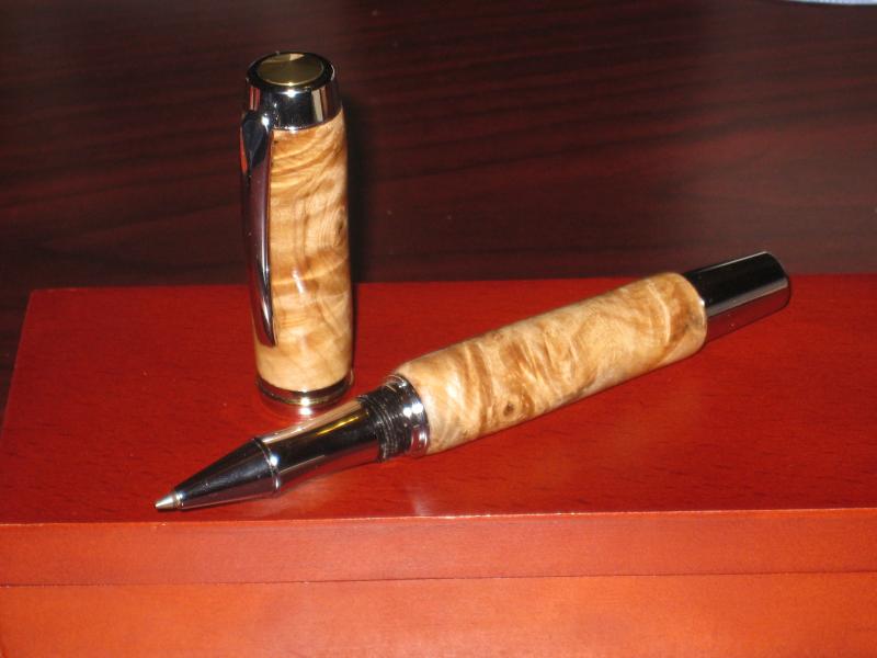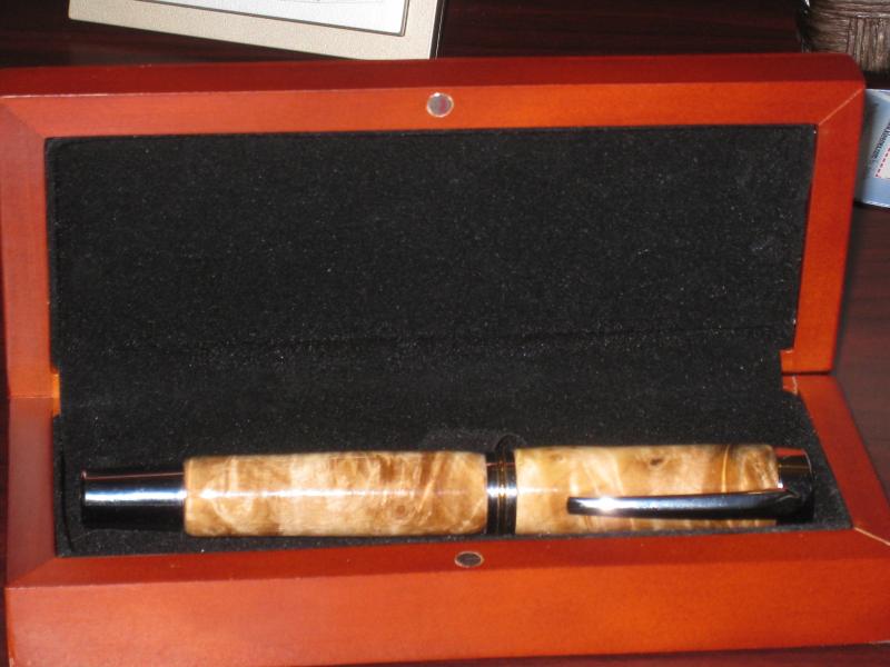 I received this very nice pen and packing material from Larry today. The burl is very intricate and my photos don't do it justice. Larry included a really cool box