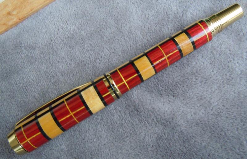This is my first attempt at posting a photo. I started playing around with segments years ago separating segments with pickguard. Eventually I became intrigued with the plaid look. This pen is made from two separate laminations cut into segments and defined with pickguard and veener. I call it the Highlander.