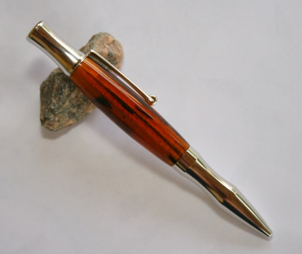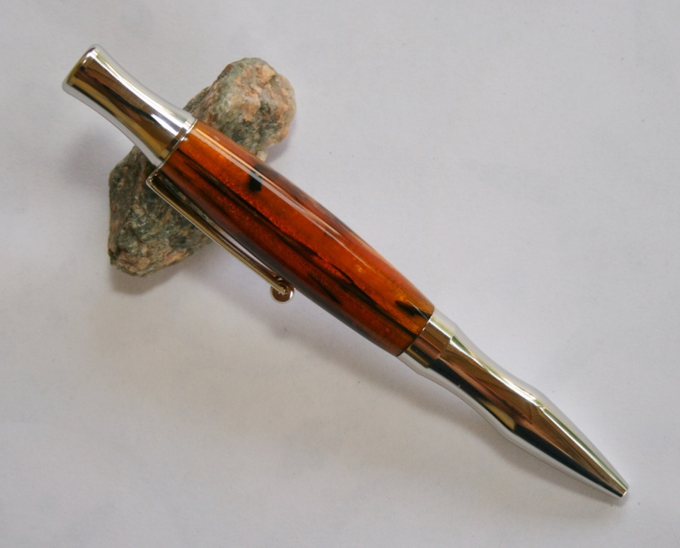 It's been a while since I've done a Woodcraft Princeton so I picked one of when we were there last week. Evelyn picked out this blank Buy Acrylic Pen Blank - Carrot at Woodcraft.com to go along with it. I back painted the blank with Testors Diamond Dust (a sliver color) spray lacquer. Fred (PTowneSubbie) says that silver will make the color of the blank pop. I wet sanded to 12000 mm and polished with hut plastic polish. All C&C welcome