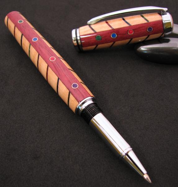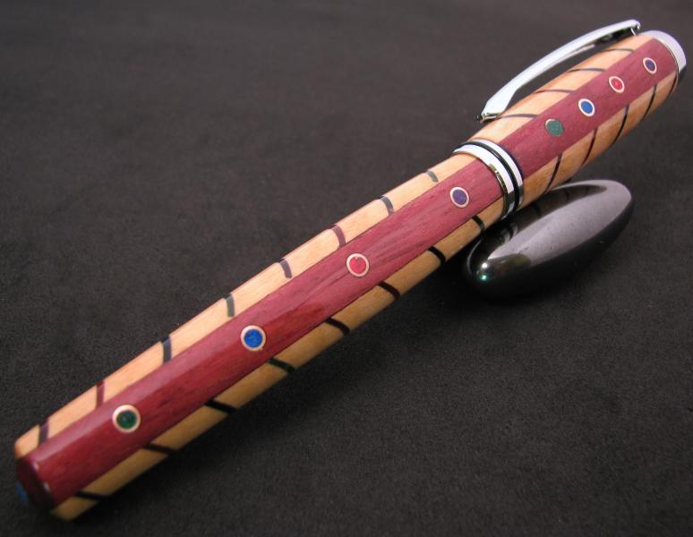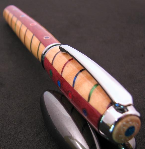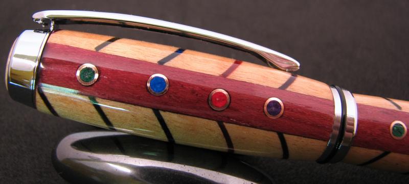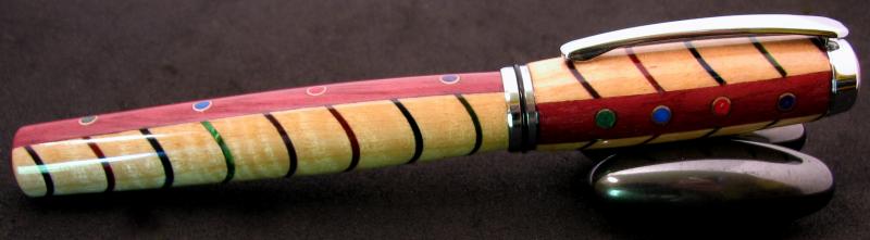 My wife said I needed to use my guitar picks that I bought on FeeBay. I decided to cut a V shape through the Fiddleback Maple with the scroll saw at 1/4" spacing and alternate the 4 colors. I then ripped the blank down the middle and glued a strip of Purple Heart and place some small dia tubing. After turning to near the shape I wanted I filled the holes with the same colors as the picks are. The over glue and mica are the scewed off and the 10 coats CA and deep and light scratch compound. That is about it Im thinkin.