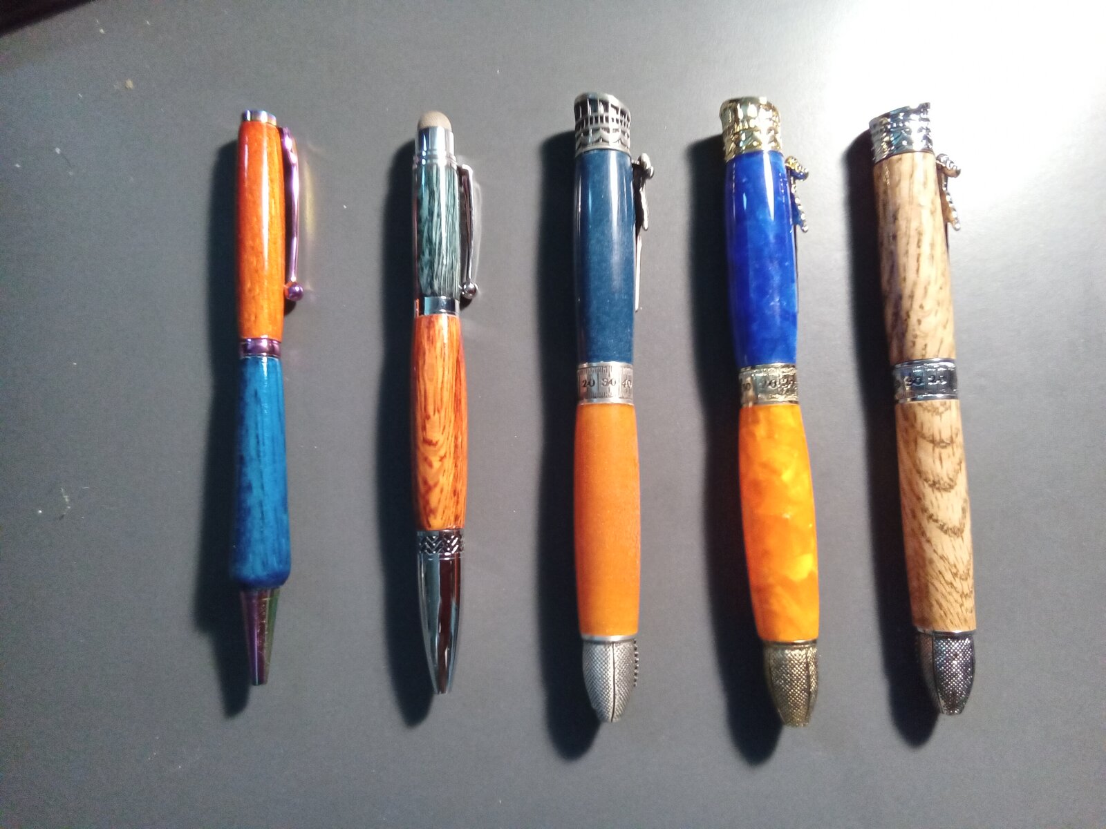 Got a fair this weekend in my hometown so decided to do some special pens. We are a huge football town (state champs eight out of ten years from 2010-2019) and the colors are orange and blue so did some of Both. From right to left - chrome football pen in oak, gold football pen in acrylicI picked up at Rockler, pewter football pen with my own made Alumilite blanks, chrome Manipulator pen in oak and dyed with Rit dye, and finally a chameleon slimline with hickory dyed with food coloring. All the woods were CA coated to seal in the dyes and all pens were sanded up to 12,000, then finished off with carnuba. Trying to decide which I like better to push more out.