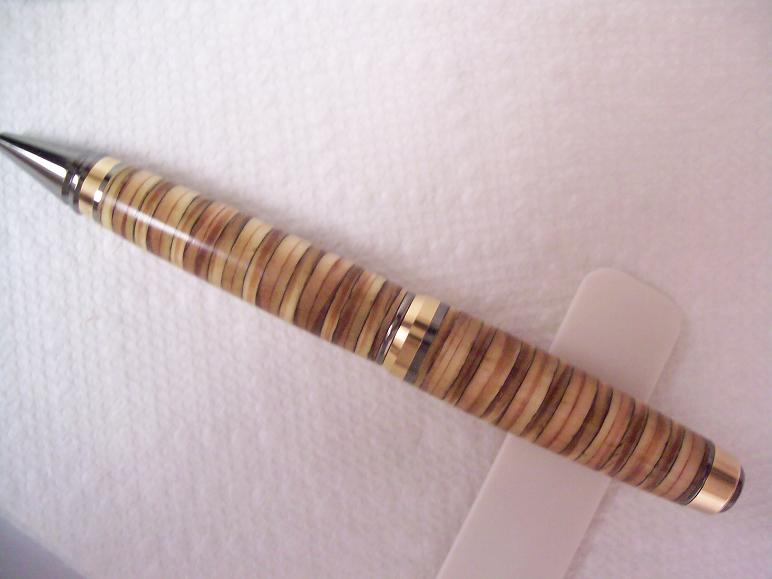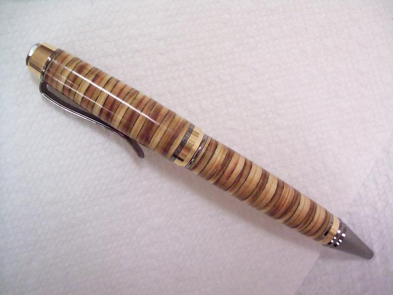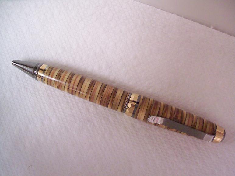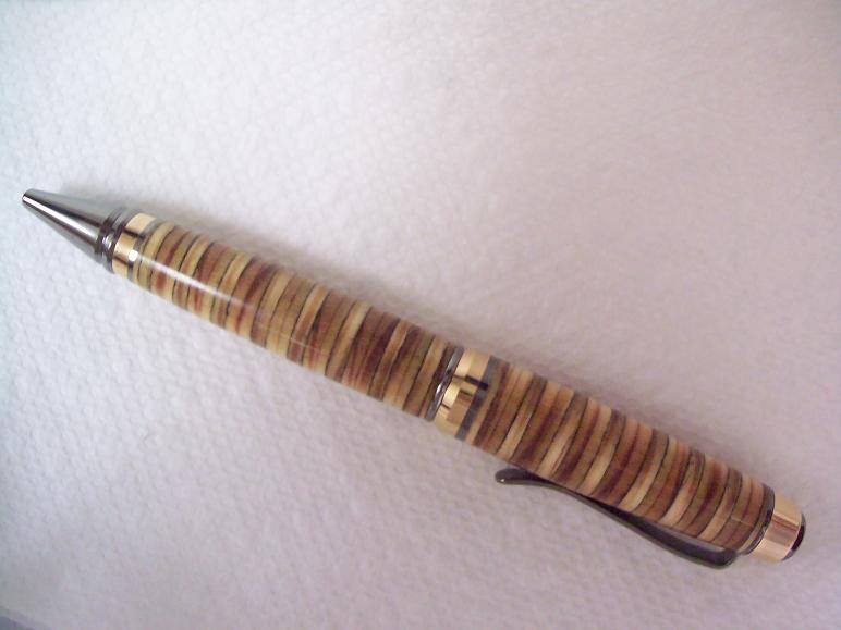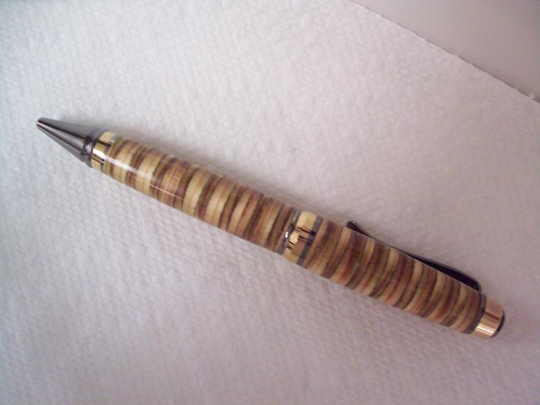 Here are shots showing 4 sides of the pen. When I glued the pieces together, I kept the grain oriented in the same direction. It probably doesn't show up in these pictures, but the end grain is slightly darker, and the opposing sides reflect more shine and depth. As far as the CA, i did not notice much difference between the end grain and the rest of the blank. One thing I did before turning was to apply a liberal coat of thin CA on all 4 sides. I figured I'd need the added support before trying to knock off the corners.