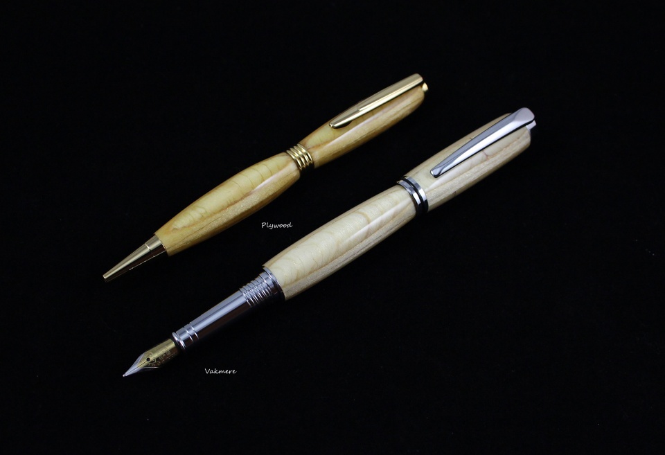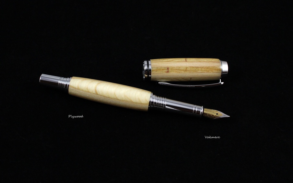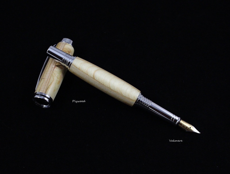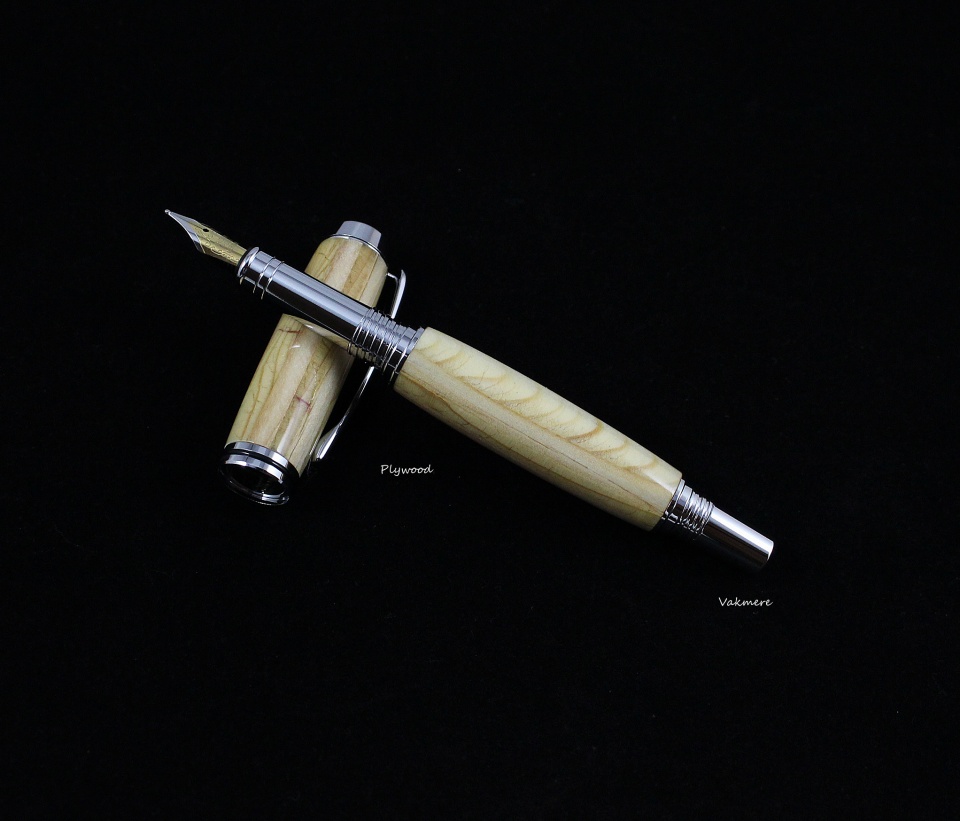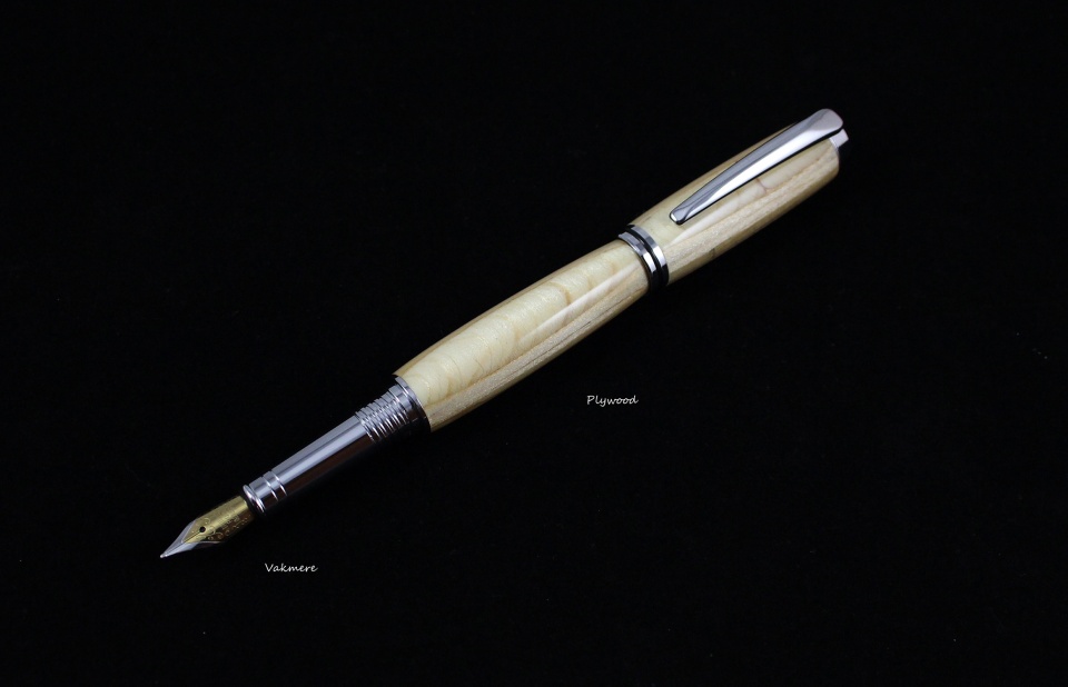 The challenge was exciting. A plywood fountain pen? Why not. I did a twist pen and key ring version of this a little over a year ago and wanted to do it one more time. Originally the wood was fished out of the dumpster behind the carpenters shop where I work I had them cut some 3/4 x 5 blanks. This time I rounded the corners on the sander before turning, coat in thin CA, small bites with a stupid sharp skew, thin CA some more until it was close enough to the bushings. Finish as usual with CA and MM. A little polish at the end. I wonder if these can be stabilized? Couldn't decide on one photo so I posted 5, sorry..... enjoy. Happy holidays.