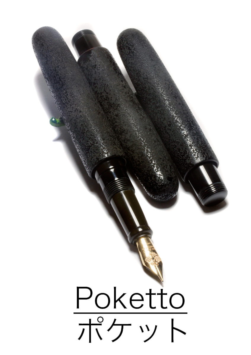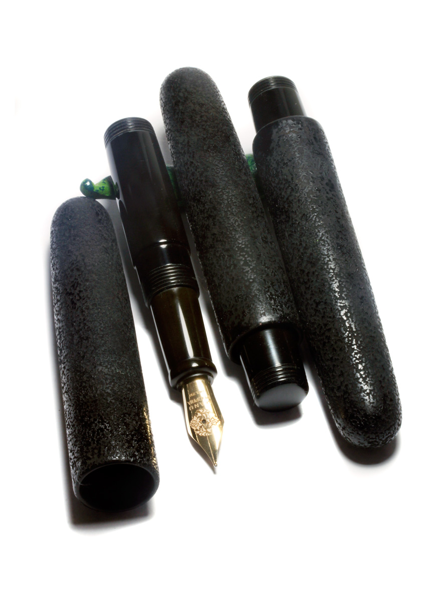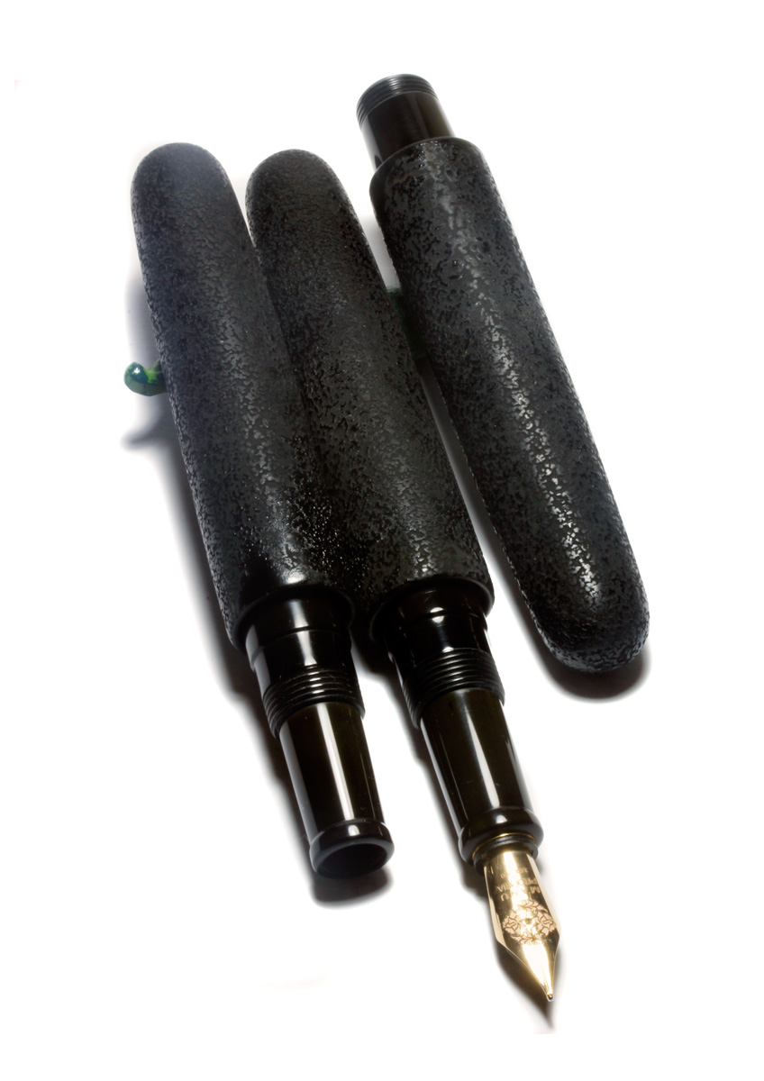 it is made from polished Ebonite, the large cap lacquered with "Kuro Ishime-Ji" black stone Urushi lacquer.