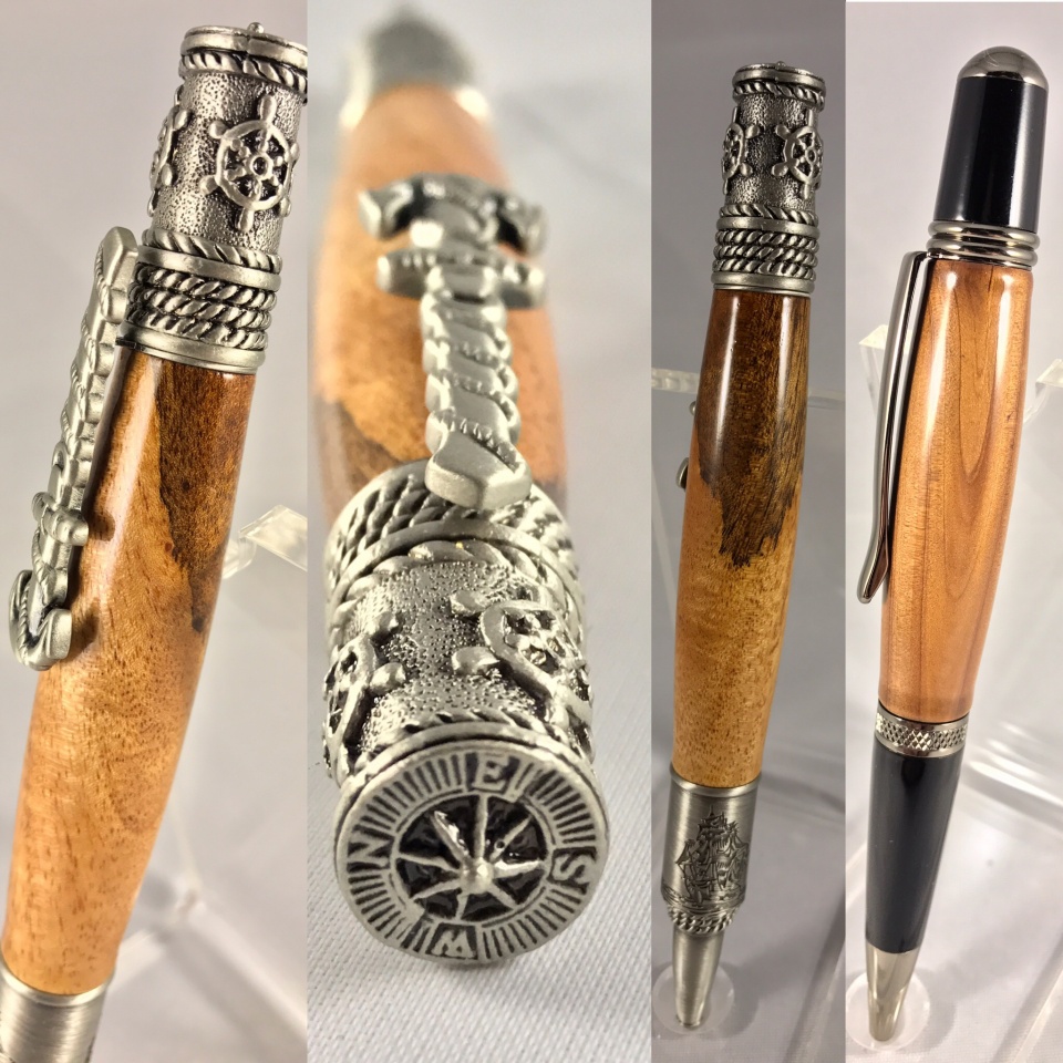 So this was my first attempt at Les' polyurethane dip method. Big thanks to him for creating the Library article as well as all his info in the emails we went back and forth with. These 2 pens have a cool story some of you may enjoy. I made these two pens for our fantastic headwaiter on a recent Carnival cruise. (Hence the nautical kit on the first one.) He said his favorite port was San Juan Puerto Rico, which we happened to be going to. Knowing we had to get creative in order to bring wood back on board the ship, and back into the mainland US, we eventually found a native Cedar pestal/mortar that we bought and I was able to cut up. The second Sierra pen is some cedar from the property of one of the people in our group. Both were engraved with his name but I didn't photo that side of the pen. Very happy with the results!