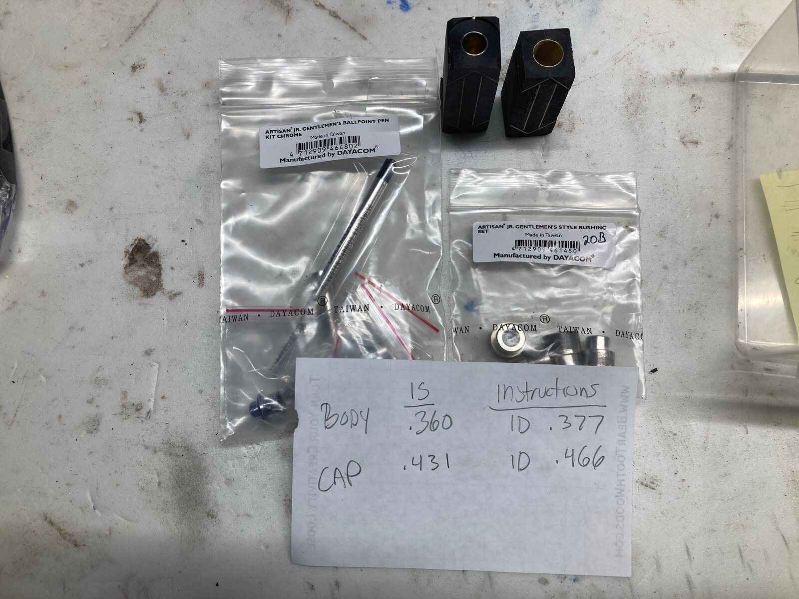 I'm stumped. I cracked open a Artisan Jr. Gentlemen's kit a couple days ago, and built segmented blanks for the body and cap. I just went to load the blanks onto my lathe, and neither body or cap bushings fit the tubes of the blanks. So, I either have the wrong bushings, or I have the wrong tubes.