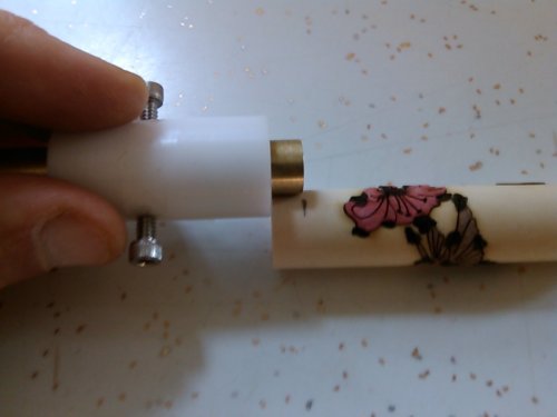 After ensuring that at least one end is square, I make a pencil mark on the blank where I would like the end of the tube to be. Then, holding the tool to the end of the blank, I extend the "insertion brass tube" to the pencil mark and lock it down with the thumb screws.