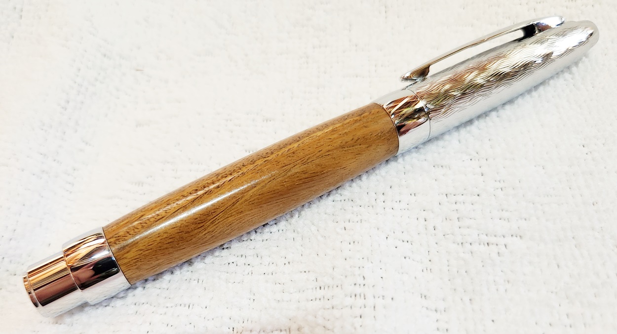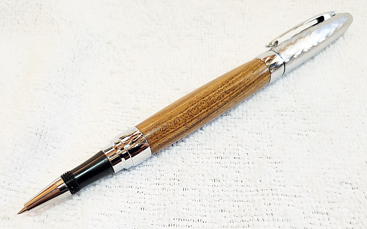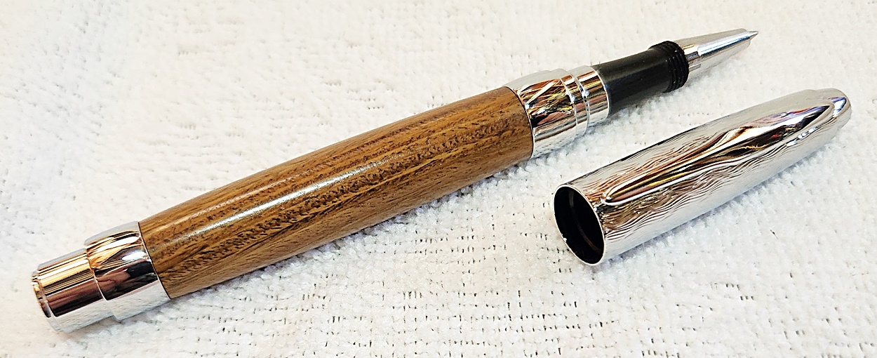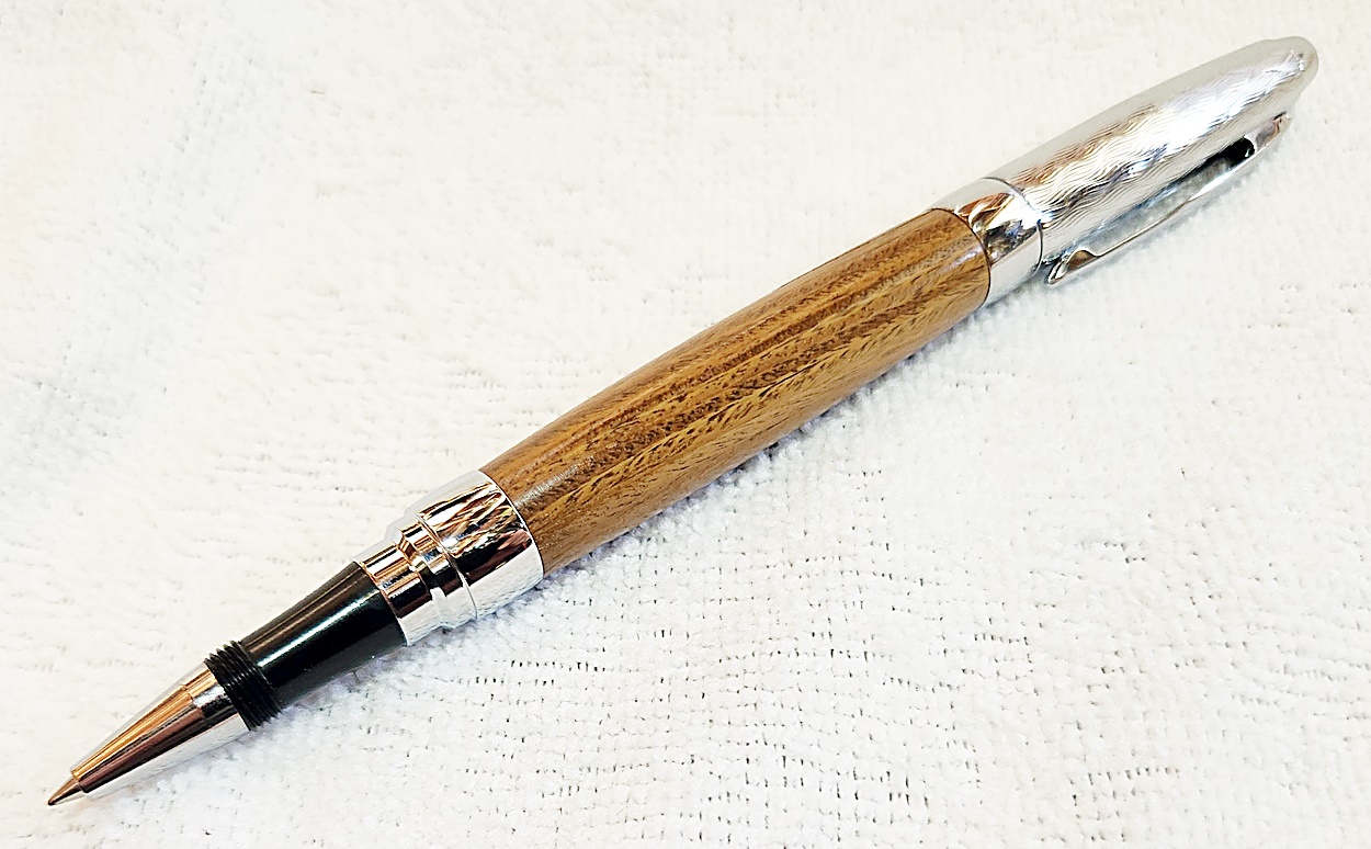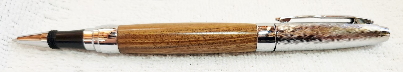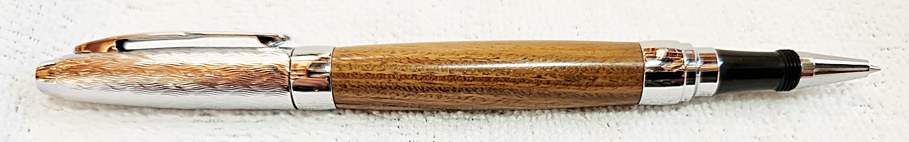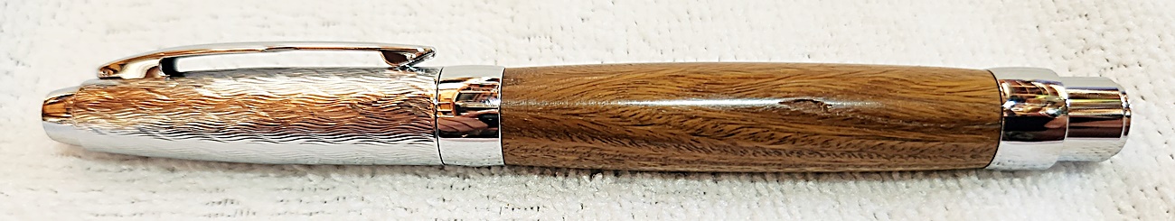 This is a Presimo screw cap rollerball in etched chrome from PSI. The wood is Lignum Vitae from Woodcraft. the finish is Pens Plus.