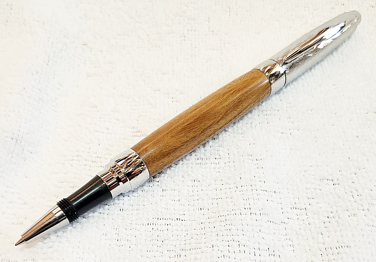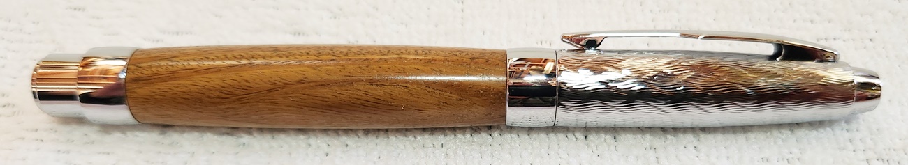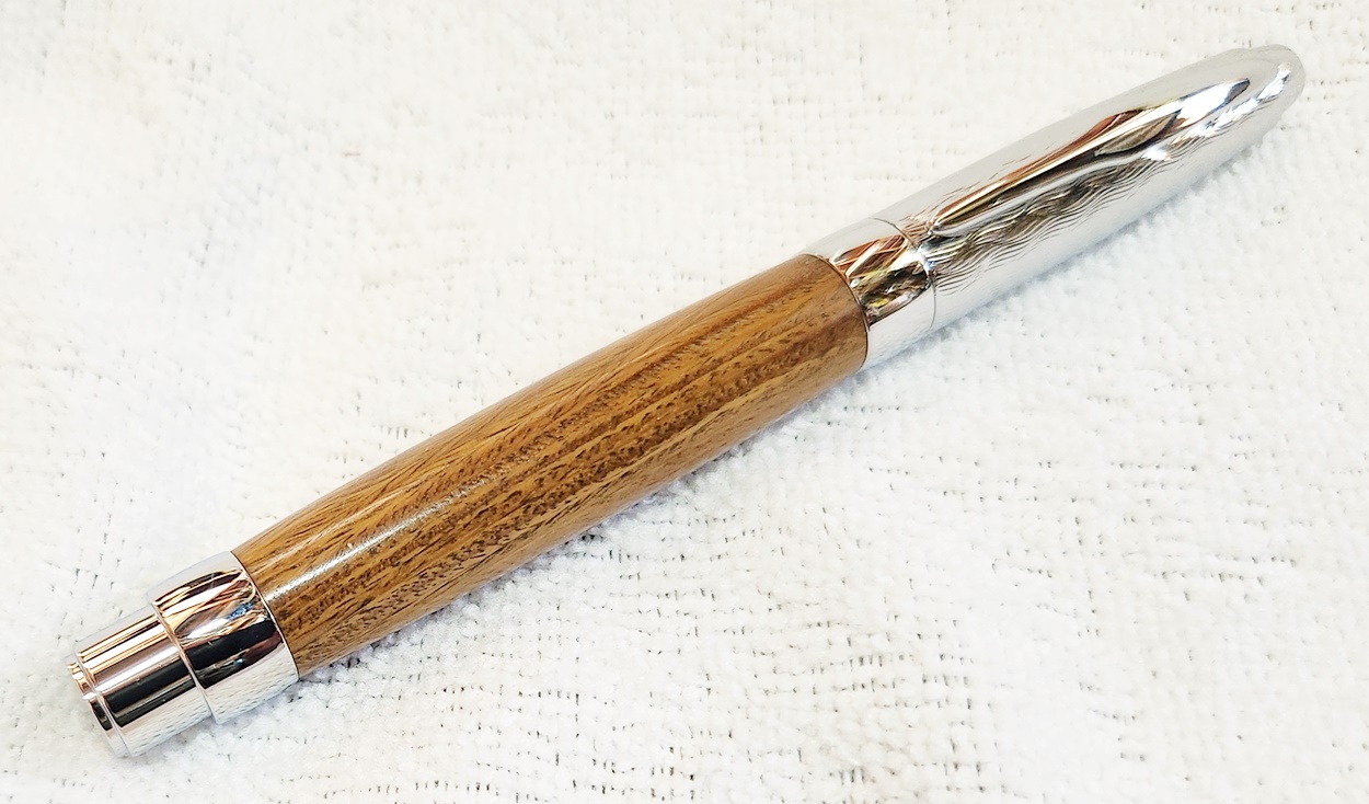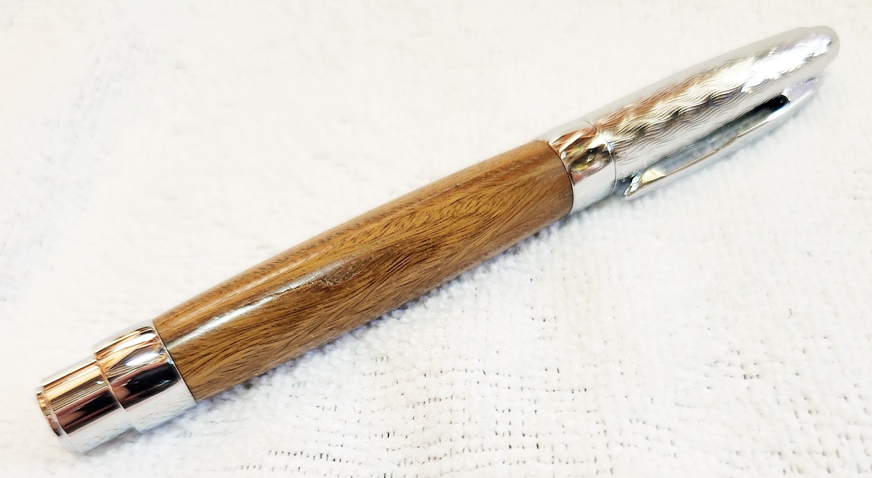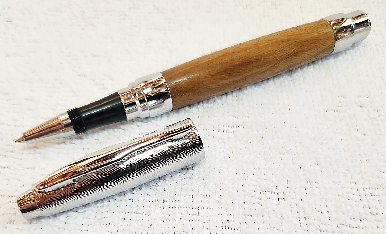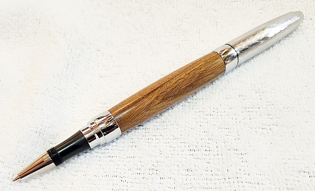 This is a Presimo screw cap rollerball in etched chrome from PSI. The wood is Lignum Vitae from Woodcraft. the finish is Pens Plus.