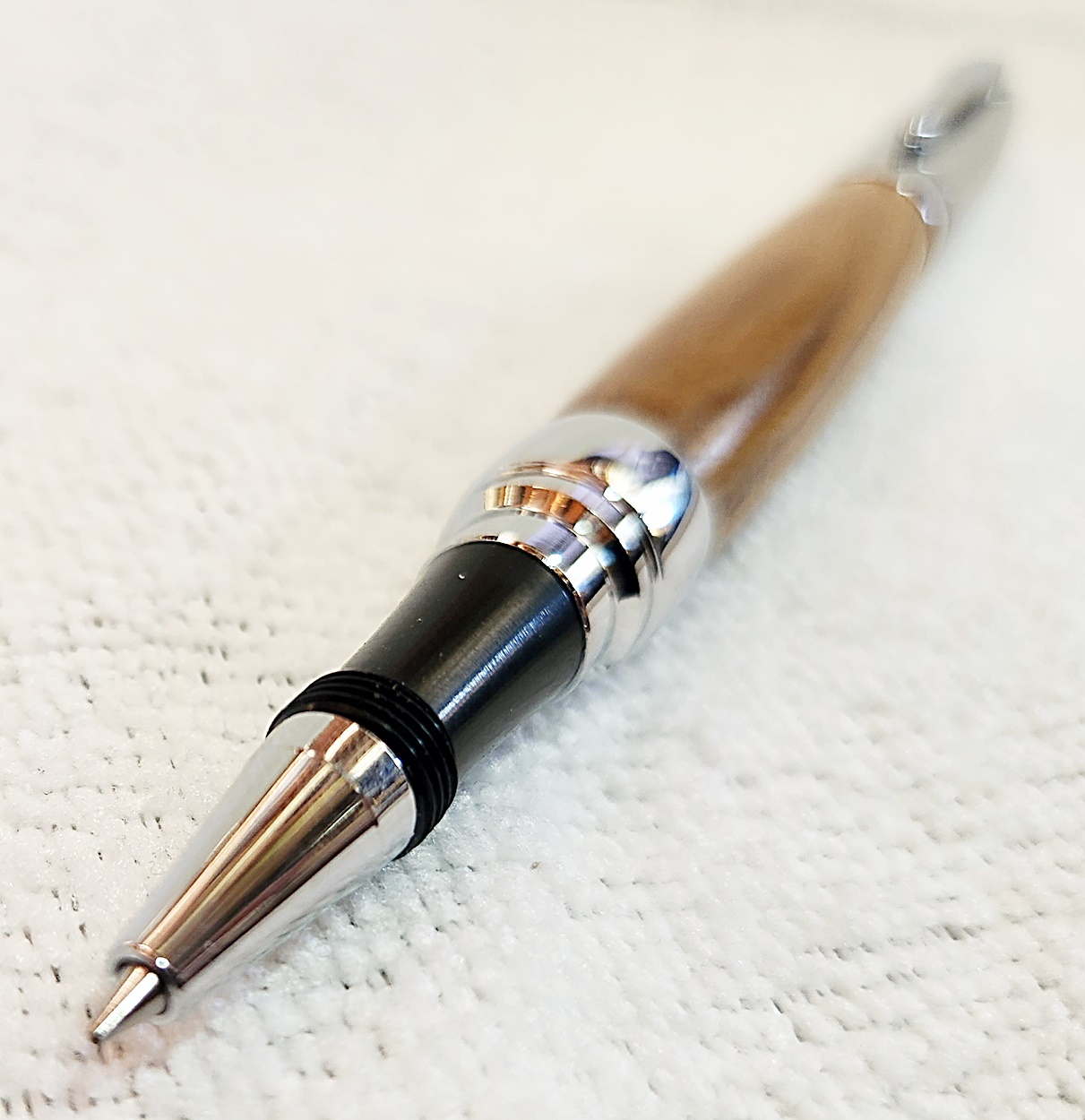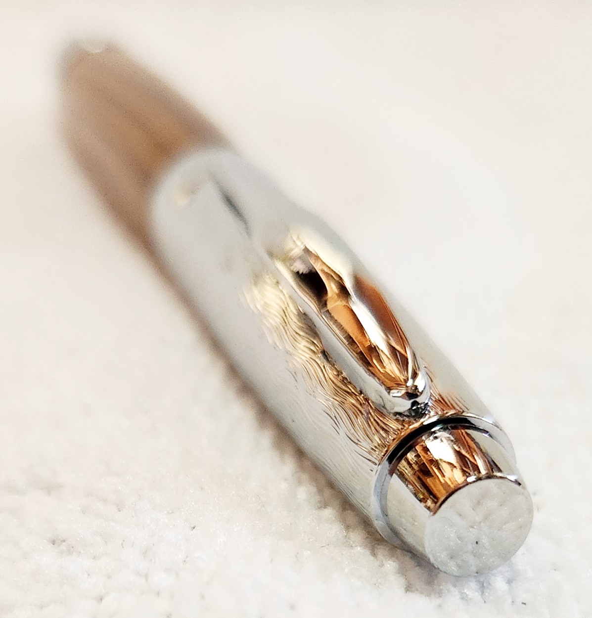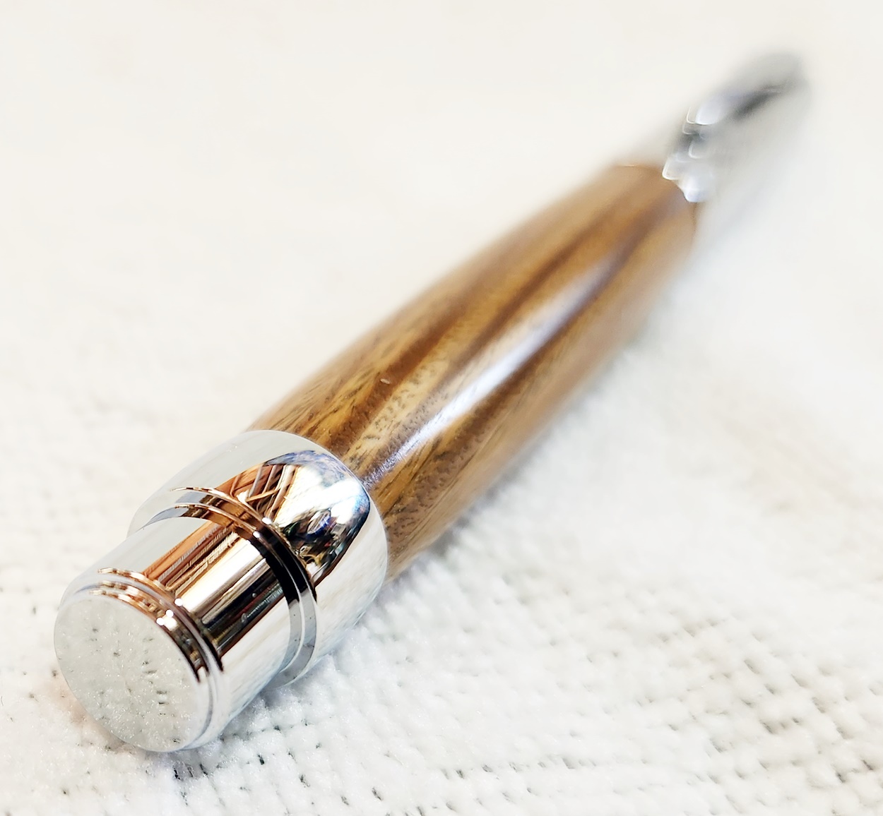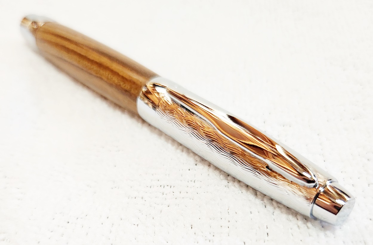 This is a Presimo screw cap rollerball in etched chrome from PSI. The wood is Lignum Vitae from Woodcraft. the finish is Pens Plus.