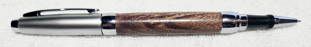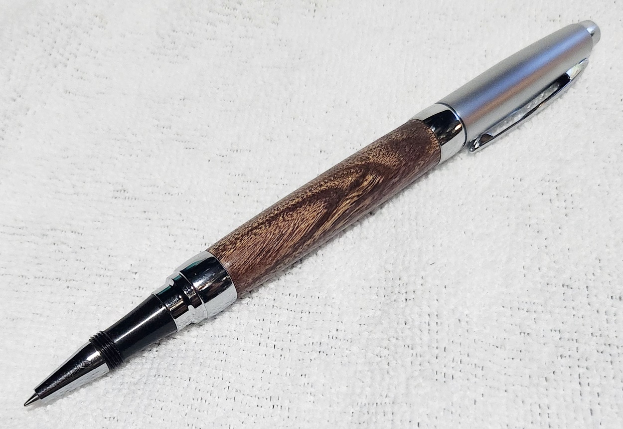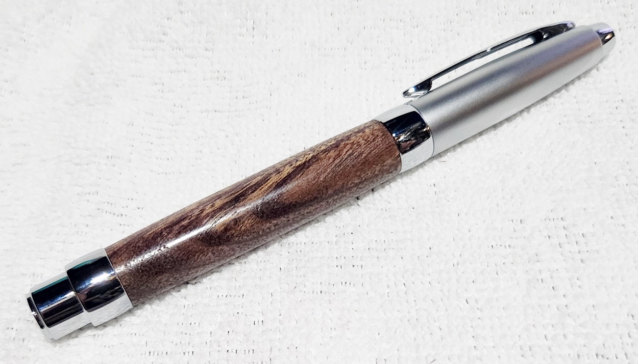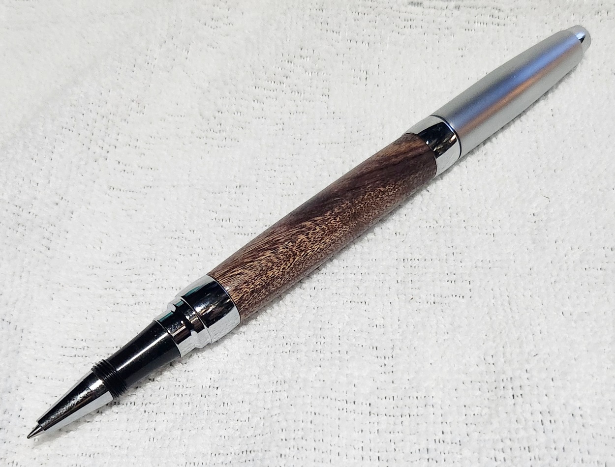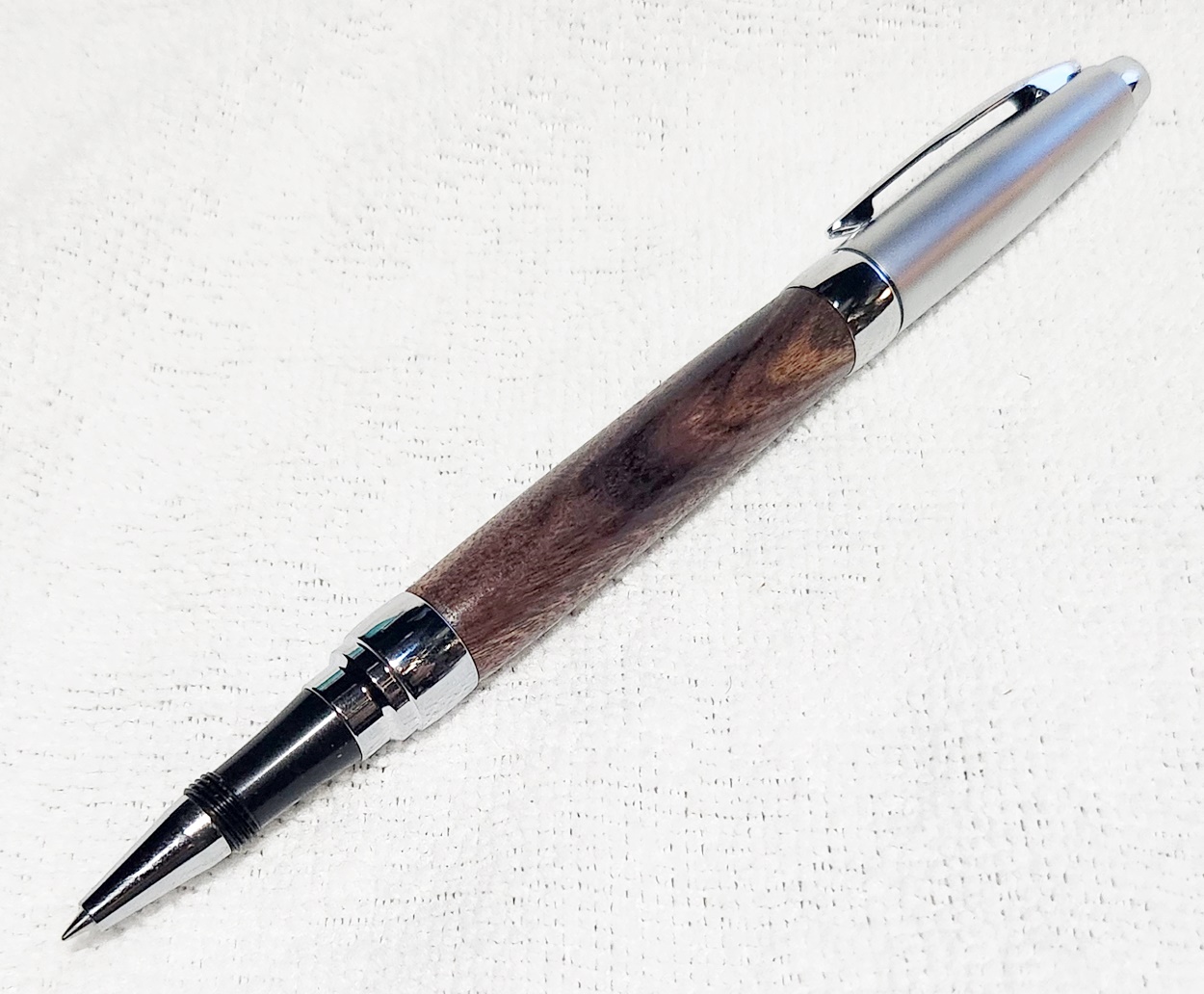 This is a Presimo screw cap rollerball pen in chrome and satin chrome from PSI. Interestingly the cap screws onto the tip, but pushes onto the back end. The wood is Patagonian rosewood from Woodcraft. The finish is Pens Plus.