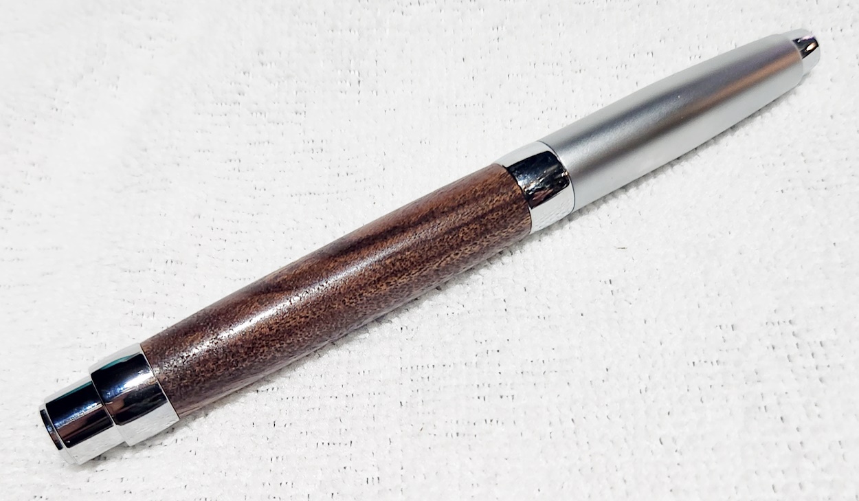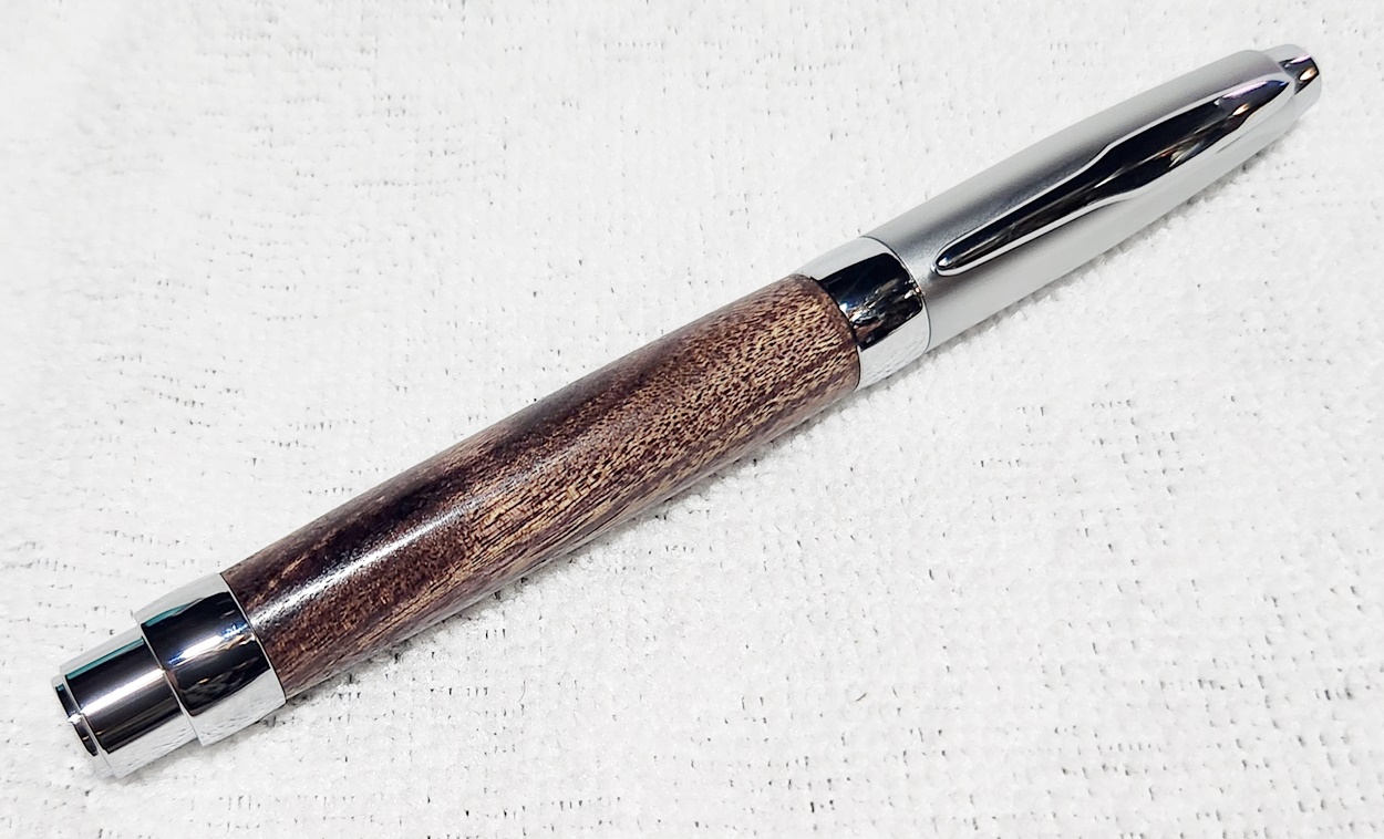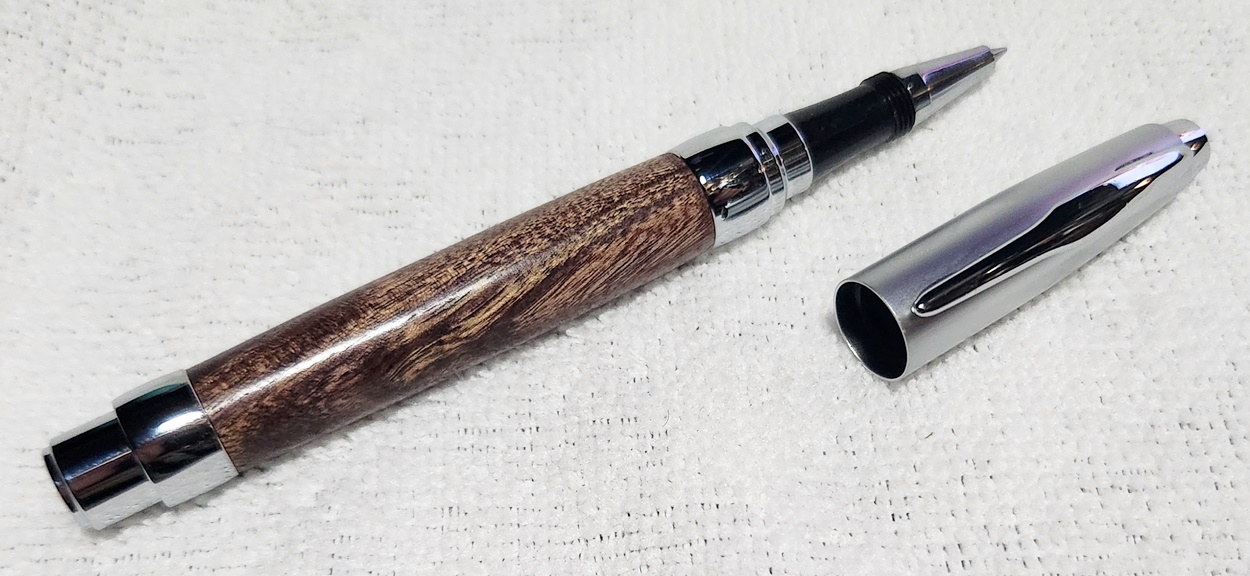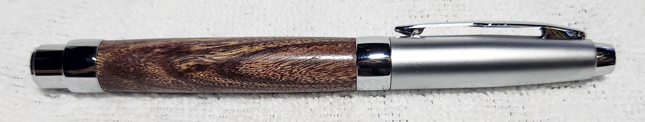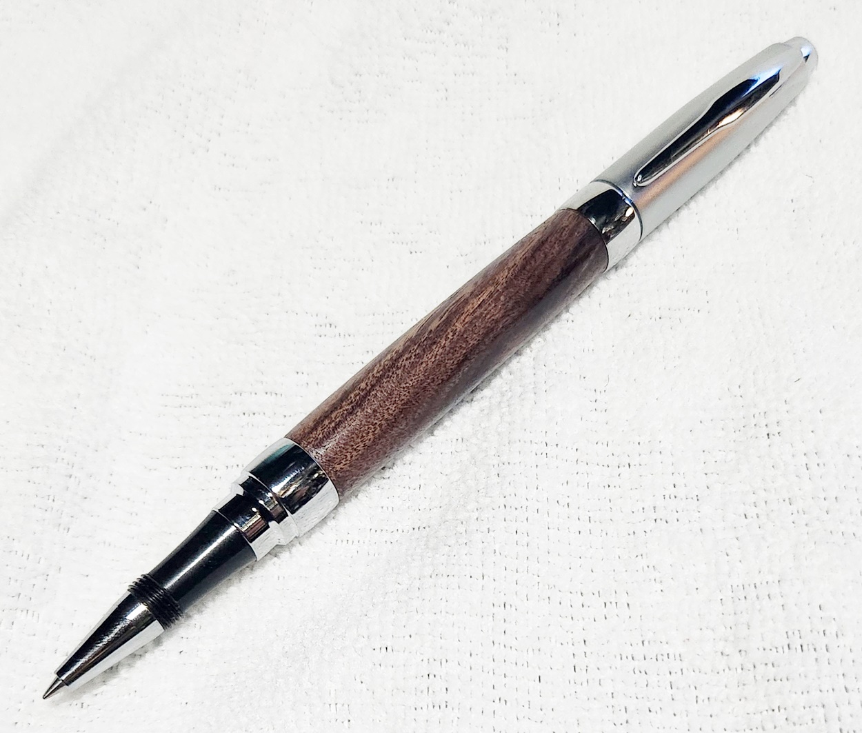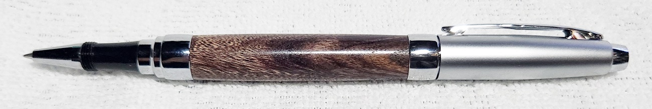 This is a Presimo screw cap rollerball pen in chrome and satin chrome from PSI. Interestingly the cap screws onto the tip, but pushes onto the back end. The wood is Patagonian rosewood from Woodcraft. The finish is Pens Plus.