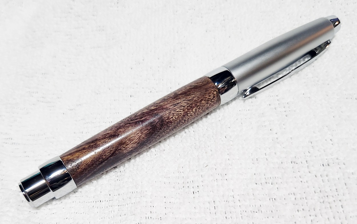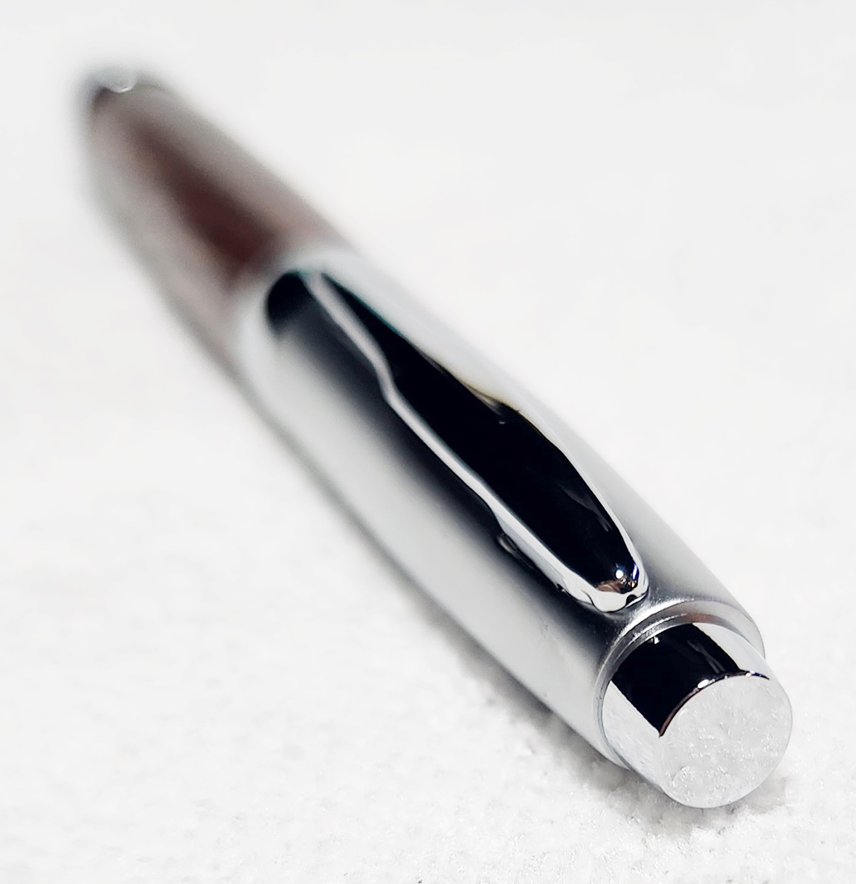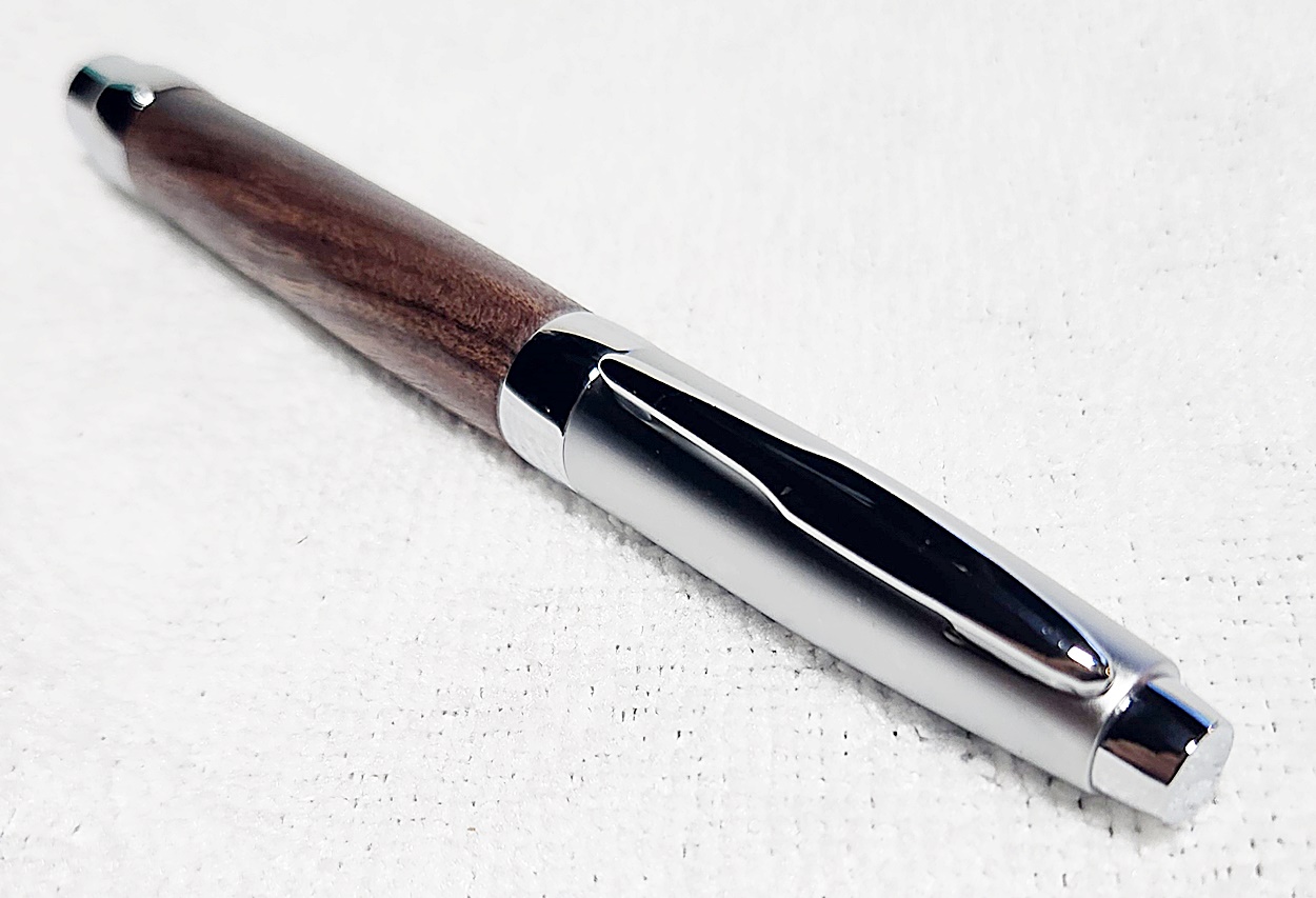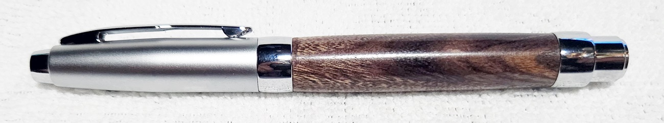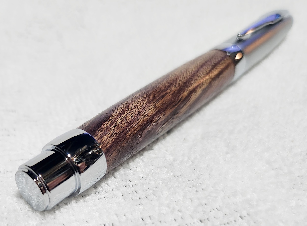 This is a Presimo screw cap rollerball pen in chrome and satin chrome from PSI. Interestingly the cap screws onto the tip, but pushes onto the back end. The wood is Patagonian rosewood from Woodcraft. The finish is Pens Plus.