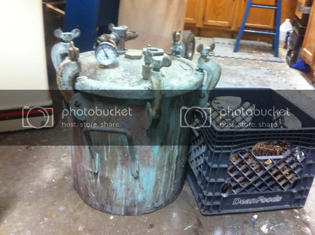 I was given a pressure if I would dig it out of the weeds behind a barn. Figured it was worth the price so I crawled I the briars to retrieve it. Replaced the pressure gauge and added a nib to fill it. Bought a new seal(wrong size). Bought some mold max and poured one. Have it sitting after tighten everything to see how it holds pressure. What do y'all think? I put it next to a milk crate to show its size. I think it's a binks.