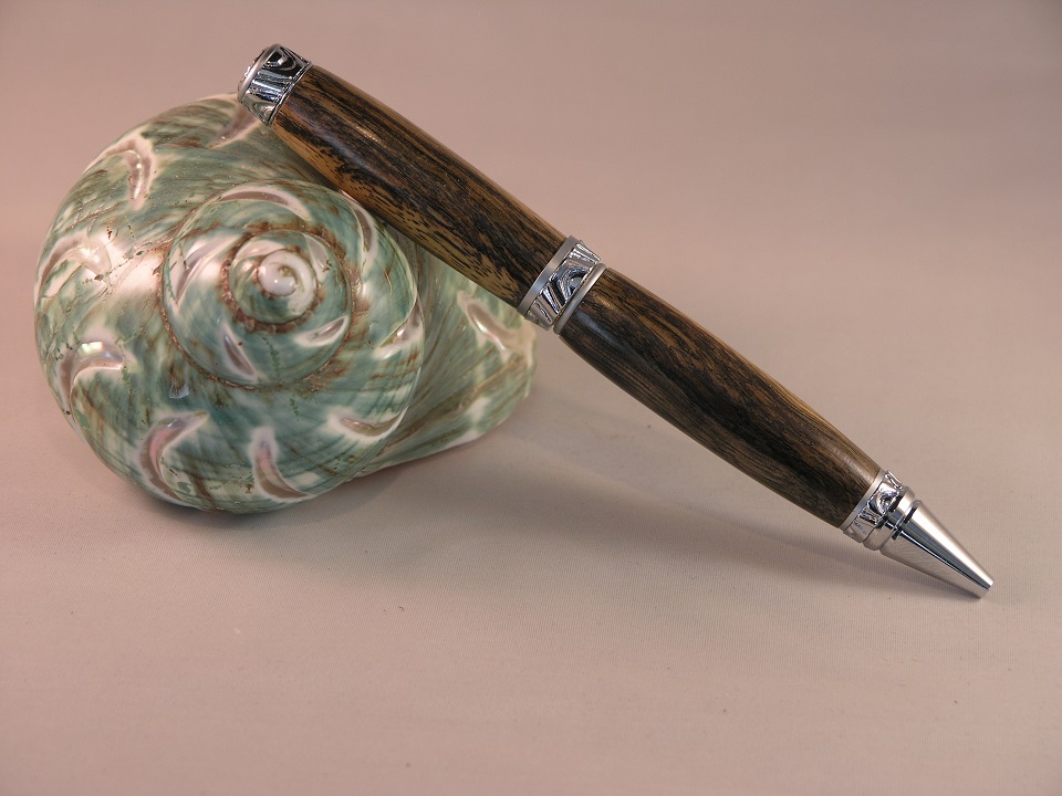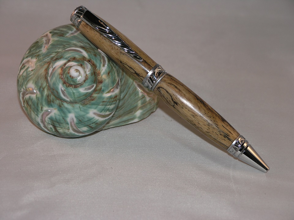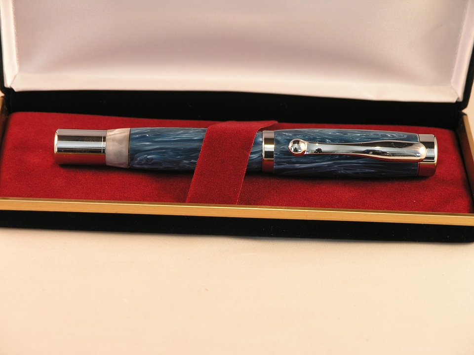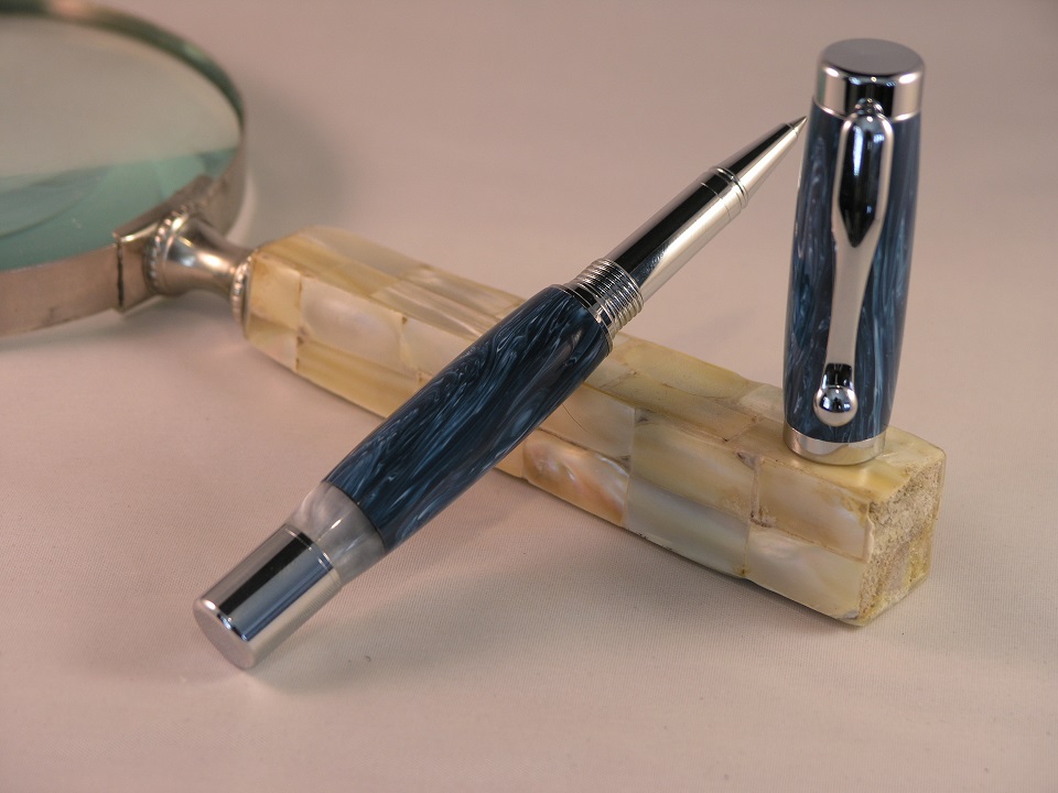 I had carte blanche to make pens this last Saturday, so I managed to make a couple that I was happy with. The first one is a Atrax in Italian blue acrylic... yes that's an oops ring at the bottom, I had an issue with how hard and brittle the Italian Acrylic was and I ended up getting carried away with the chisel and had to fix it with some white Mother of Pearl I happened to have in my drawer.