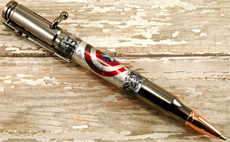 It's a custom Captain America shield decal, set against embossed aluminum with boiler plate ends and cast in Alumilite. C&C always welcomed