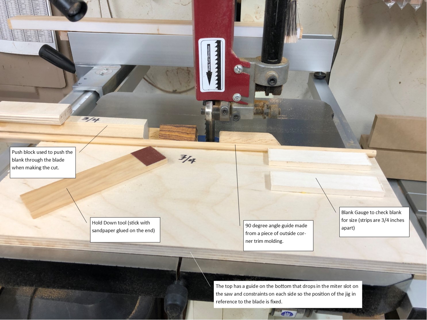 Today I built a copycat of the PSI Corner-B-Gone jig. Previously I had a couple of bandsaw jigs to cut the corners off of my blanks based on an angle that was a fixed distance from the blade. I had one for 3/4 and one for 7/8 blanks. The problem was that not all of my blanks are square and I also don't always get the tube perfectly down the center. These problems cause the blank to be quite out of round when I start to turn it.