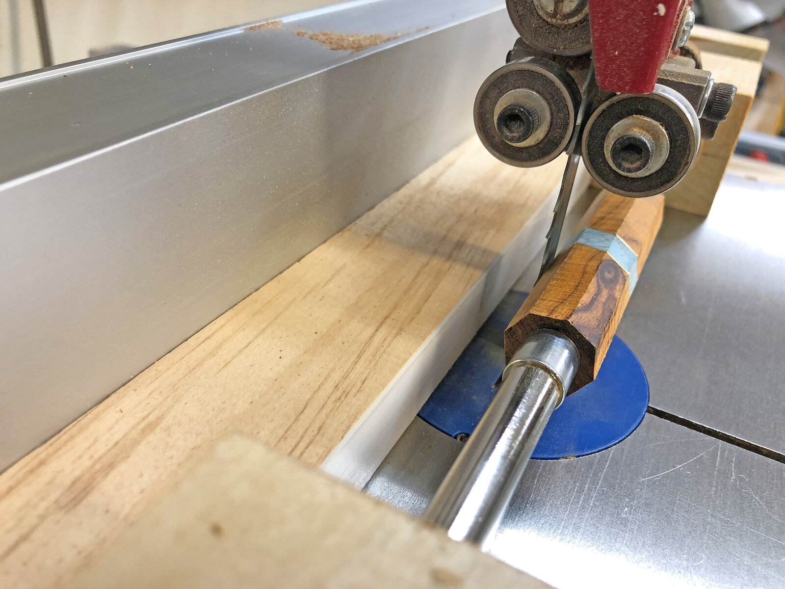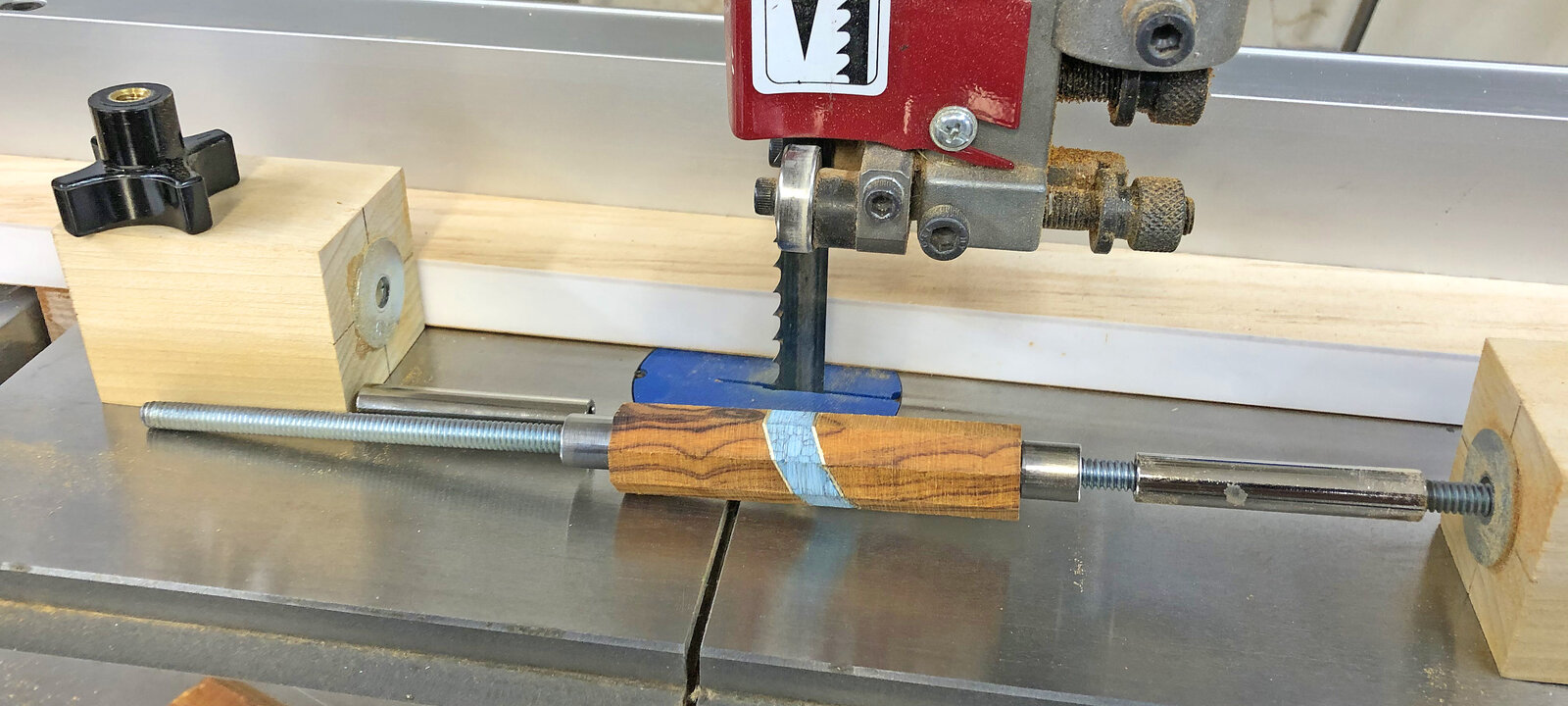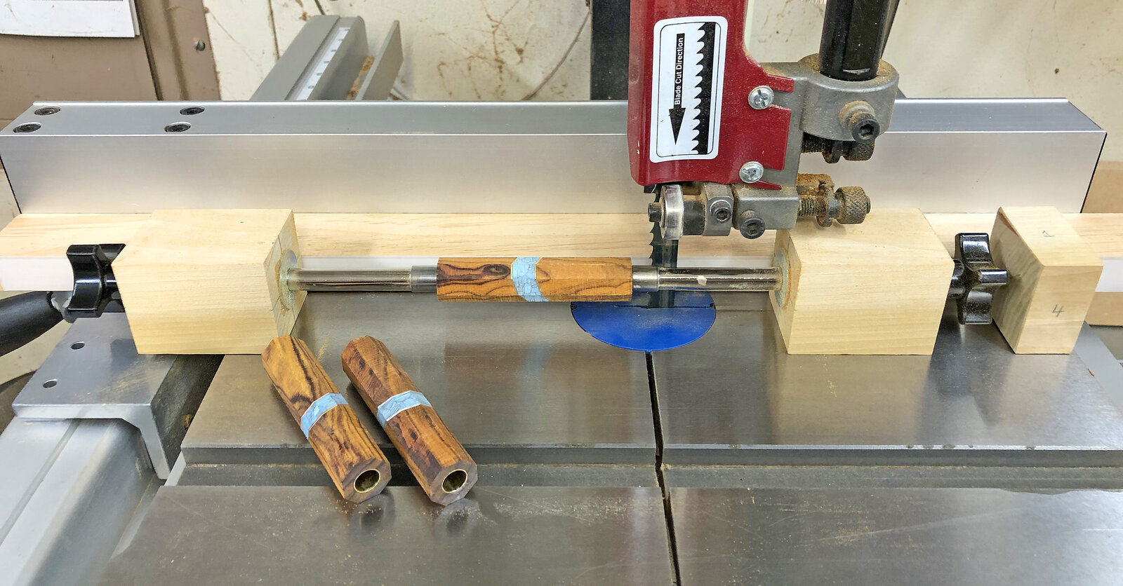 The copycat jig is essentially made from some 1-3/4 square blocks of Poplar, a piece of 1/4-20 Ready Rod, some spare barrel trimming sleeves (used for spacers) and a couple of 1/4-20 star knobs. I had all of this stuff on-hand so the cost was negligible. Mount the blank using the bushings, set the bandsaw fence to the desired distance and run the blanks through rotating the jig a quarter of a turn between cuts first to square up the blank with the tube, then by rotating the blank in the fixture and another four passes to cut the corners off. After eight passes you are left with a relatively symmetrical octagon shape on center with the tube.