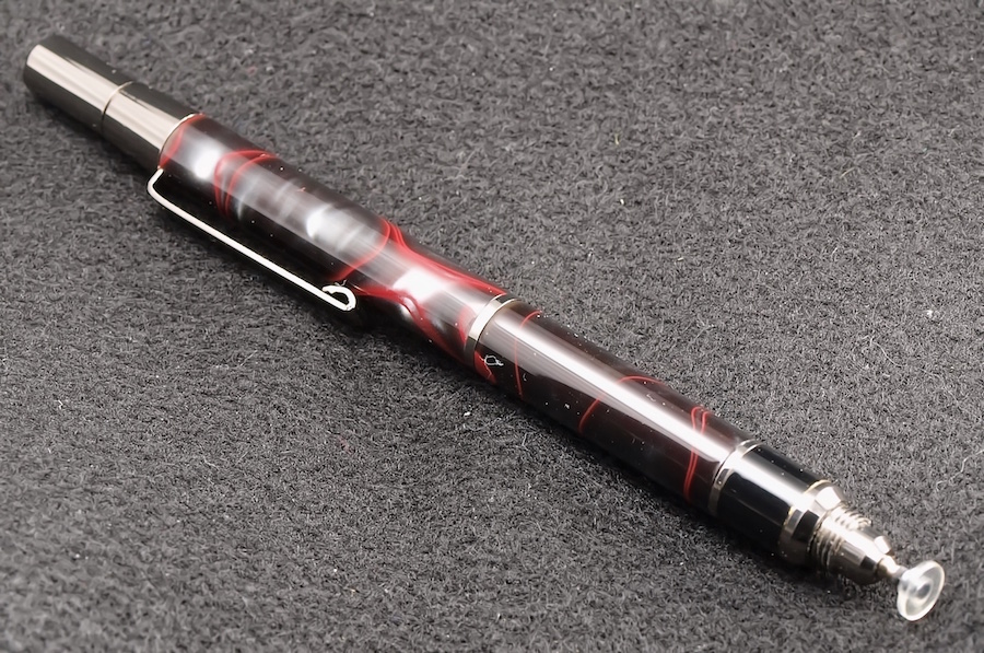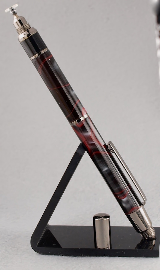 I prepared the tubes by painting them red and glued in place. I then used a 23/64 drill to cut a 0.03 deep pocket for the clip on the long pen side blank. I finished the blanks and filed a notch for the clip. On the stylus side assembly I sanded away the brass collar to eliminate the clip notch.Then assemble the pen.