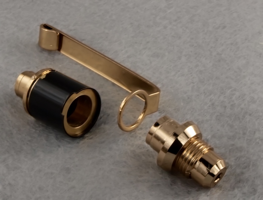 The first thing I had to do was move the clip from the stylus side to the pen side. This is a stylus first and a pen second. I scarfed up the gold stylus tip to see how the clip was secured. The first pic shows the assembly apart. I knocked the black chrome nib assembly apart using a pin punch and a hole drilled in MDF to support the clip.