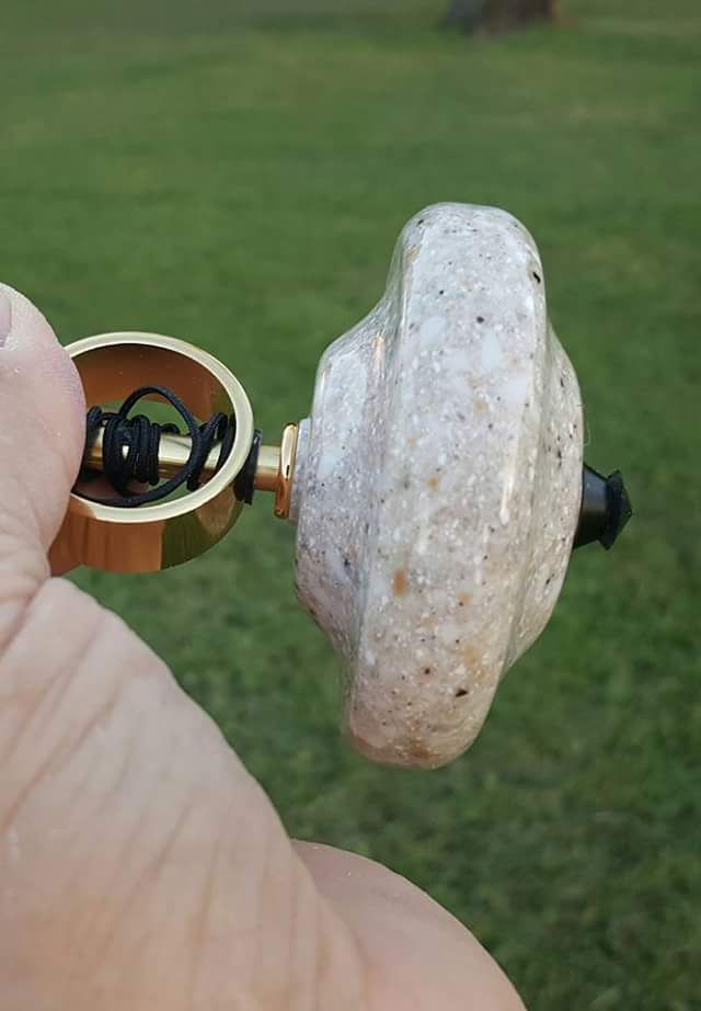 My PSI Spinning Top. I ordered the kit from Turner's Warehouse on a Saturday and it arrived the following Monday. I did a glue up of 1/2" Corian for the top body it was 3" x 3" x 1 1/2". The finished diameter is just over 2 3/4". The srarting weight was around 10 ounces and the finished weight was 5 1/2 ounces. It was a fun kit to make and spins really well. All C & C welcome. Thanks for looking.
