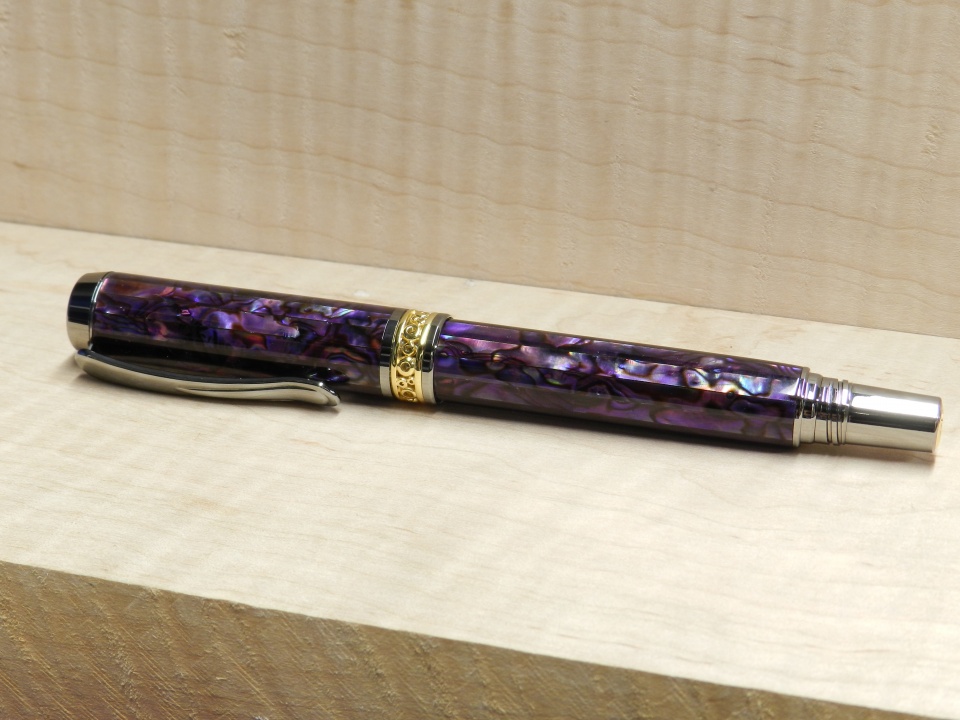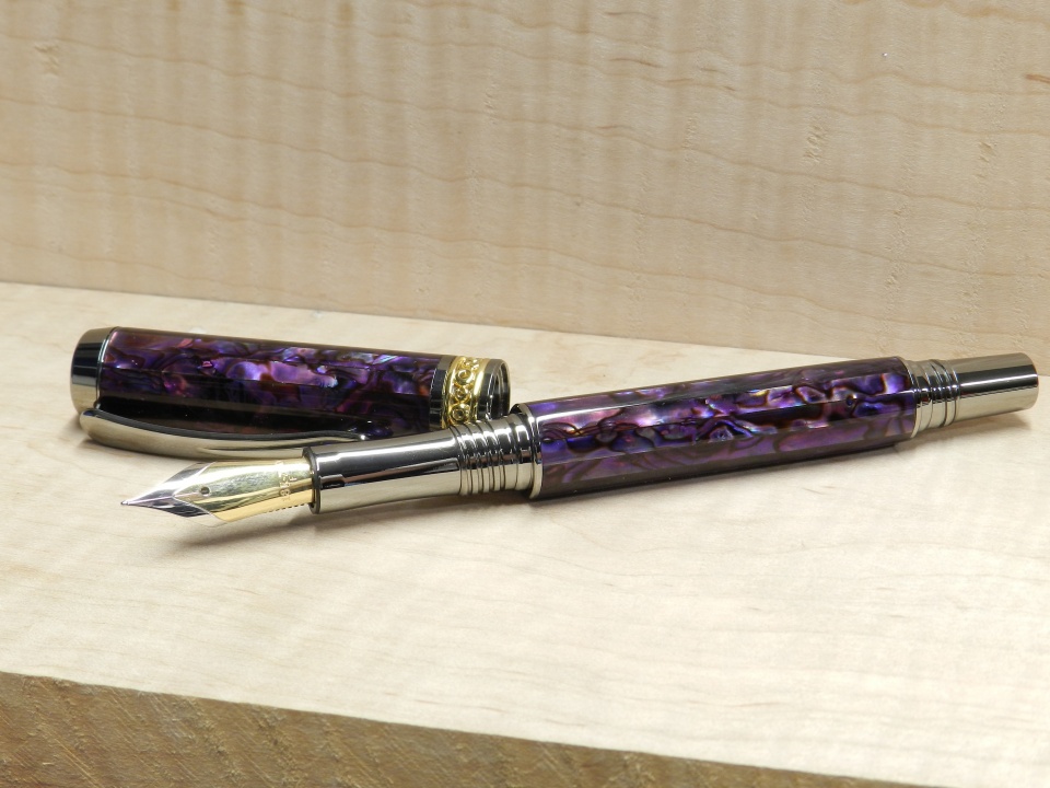 Here's a pen I just finished for a customer. It's a Jr. Anthony with purple abalone blanks by Brwnsfn2 and purchased through Ed and Dawn at Exotic. The nib is an 18k gold two tone nib from Meister nibs.