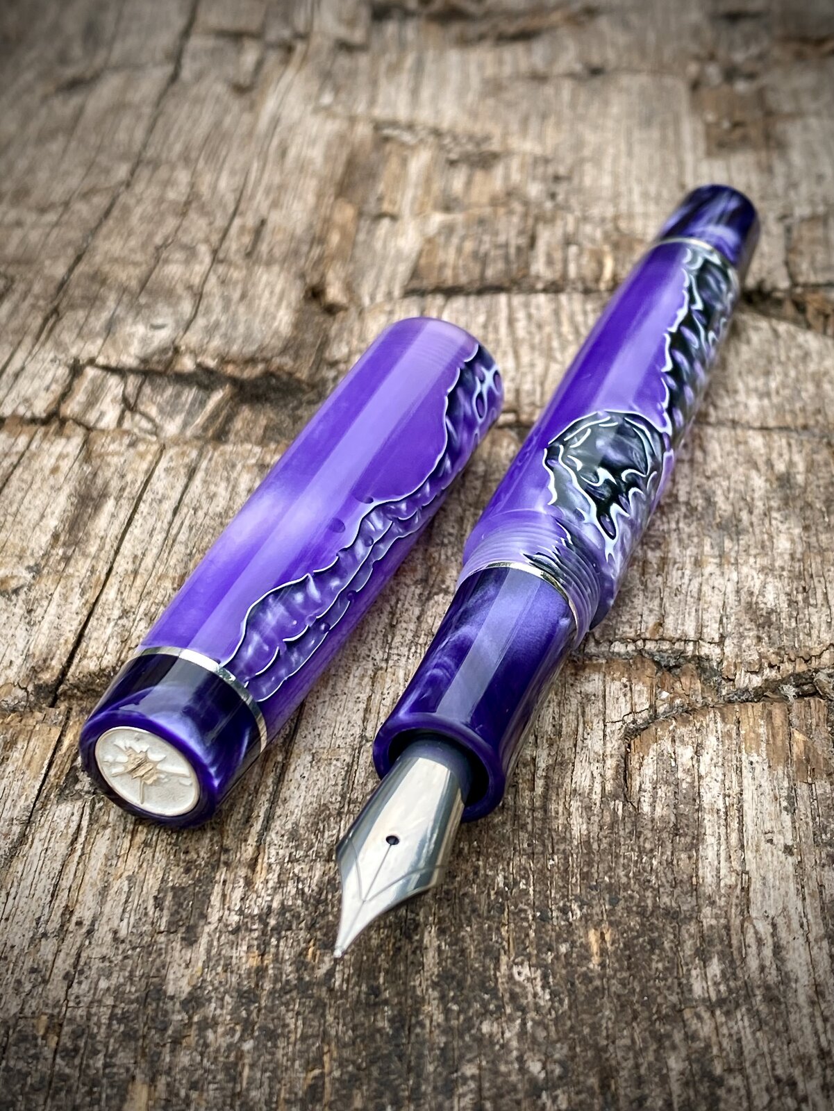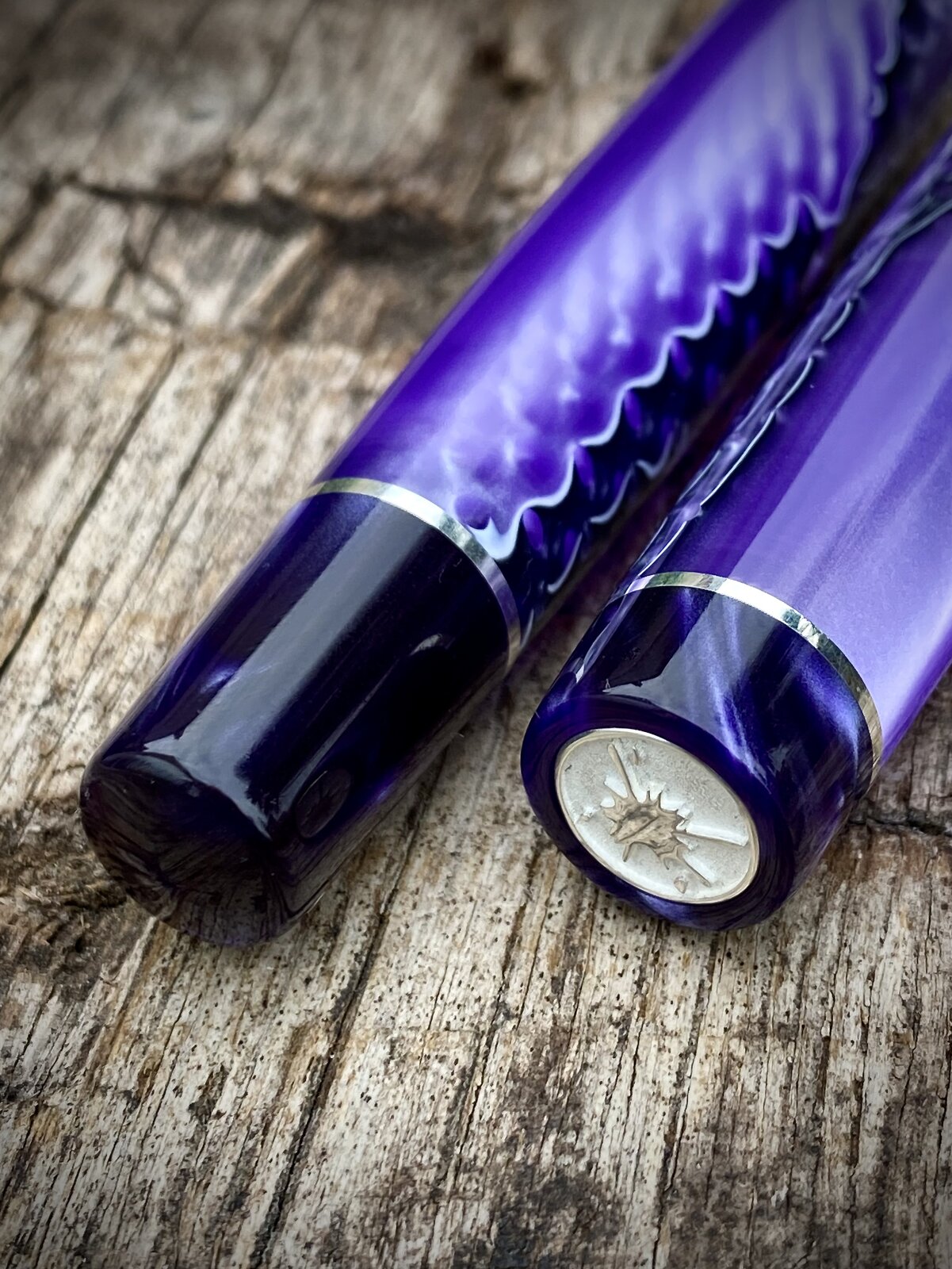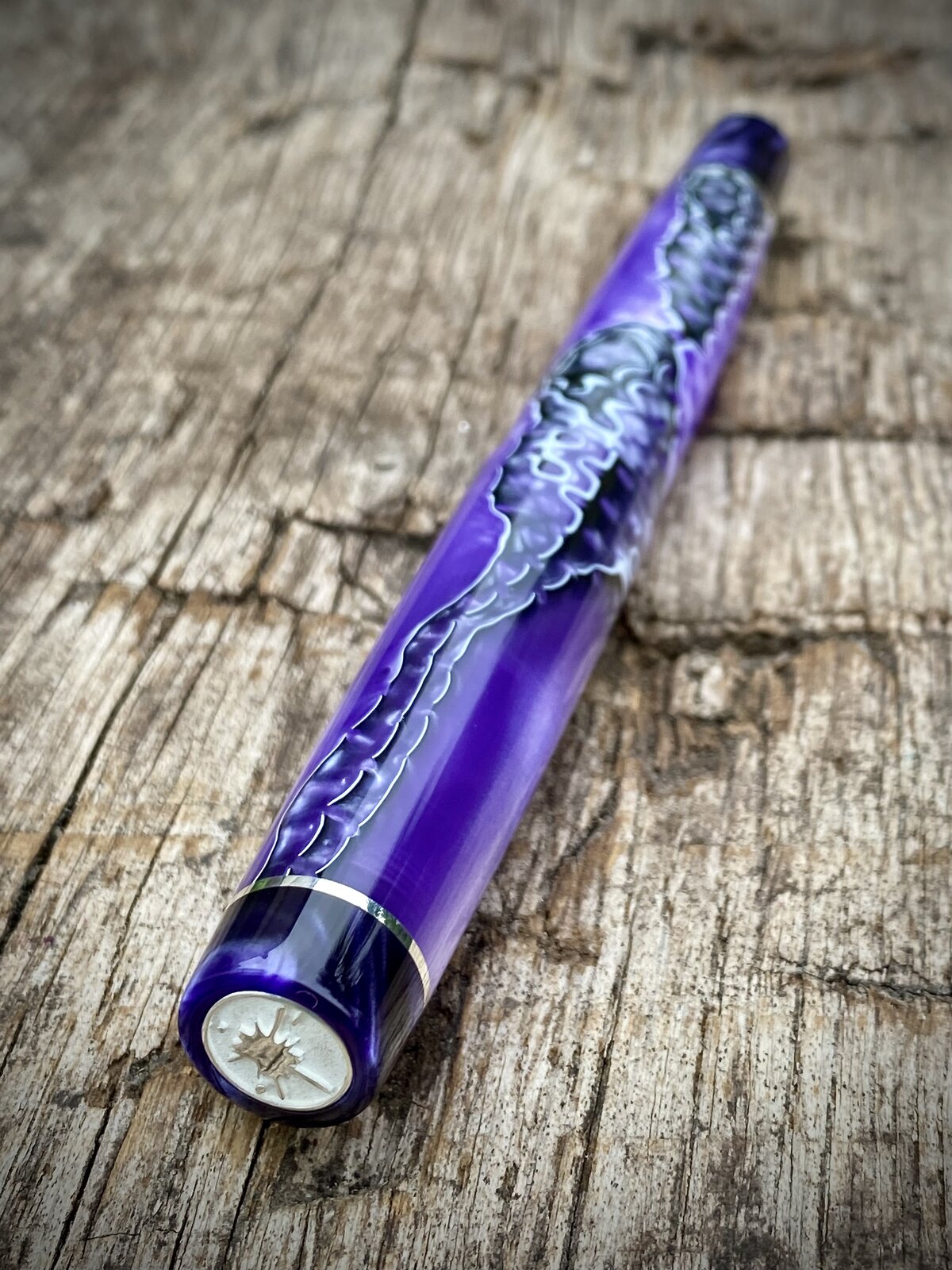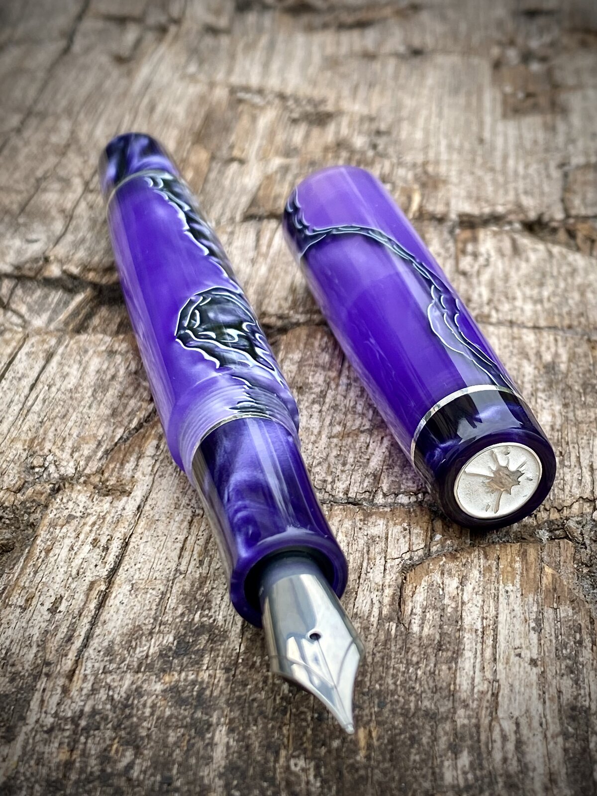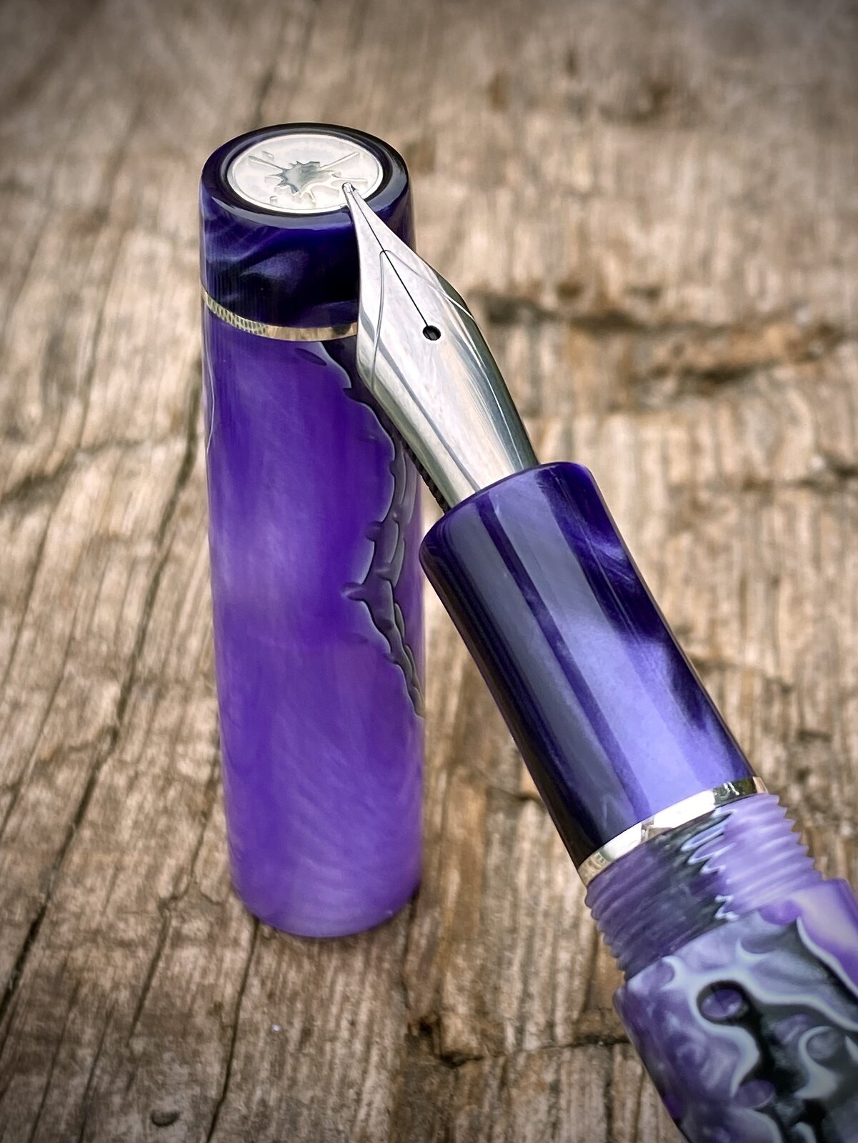 Anyway here it is. 13mm cap threads and 15mm barrel. Jowo nib and c/c fed. Sterling silver accents and purple complimentary finials and section.
