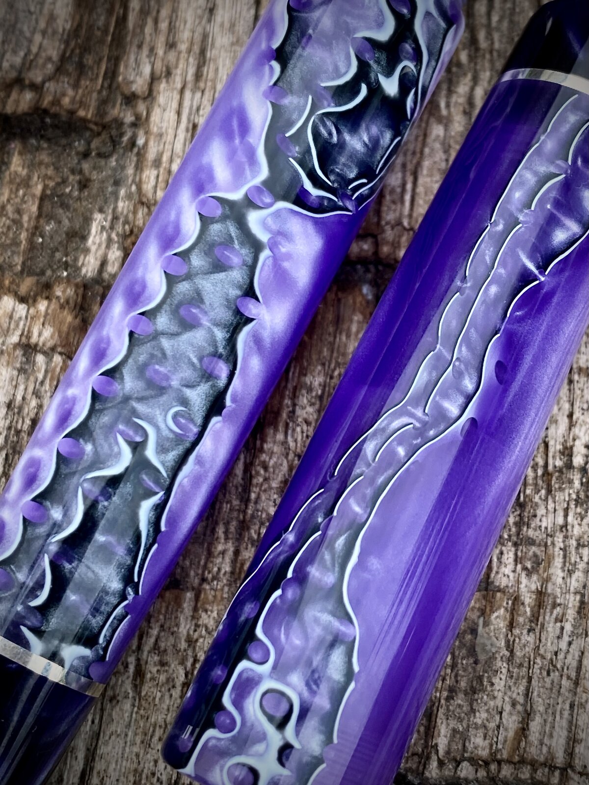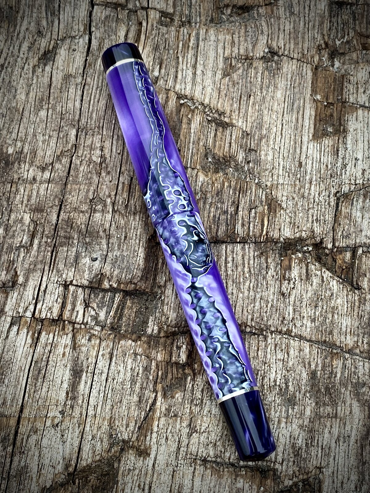 This material far exceeded the expectations I had when I first bought it. It's acrylic and I think it looks like some kind of geological seam running through it. I'm not even sure what it is or how it is made, probably some laser printing wizardry. Anyway I made a point of lining it up between cap and barrel and it just looks really effective.