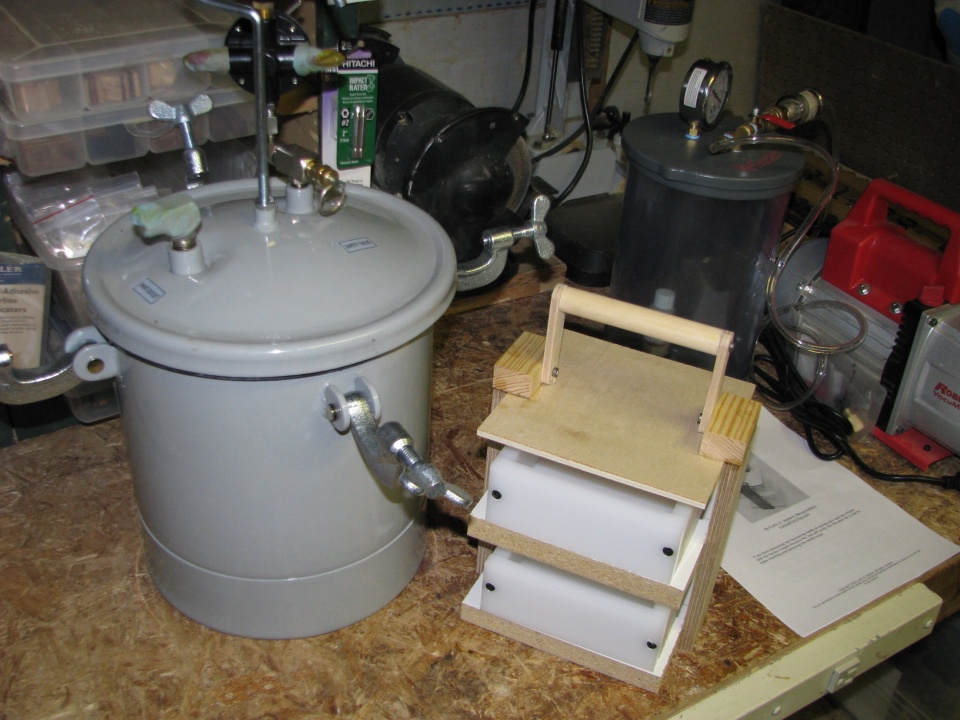 The pressure pot is nothing special. Harbor Freight 2-1/2 gallon with a discount coupon for a cost of $79.99 plus tax. I have a small nailer compressor to power that when it's ready to use.