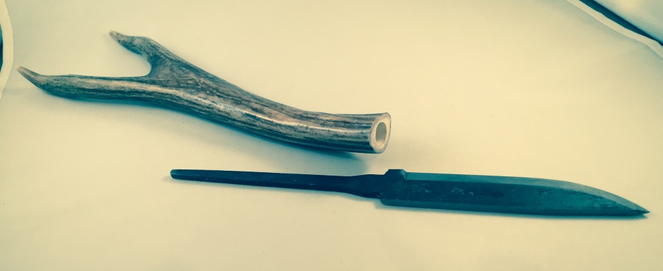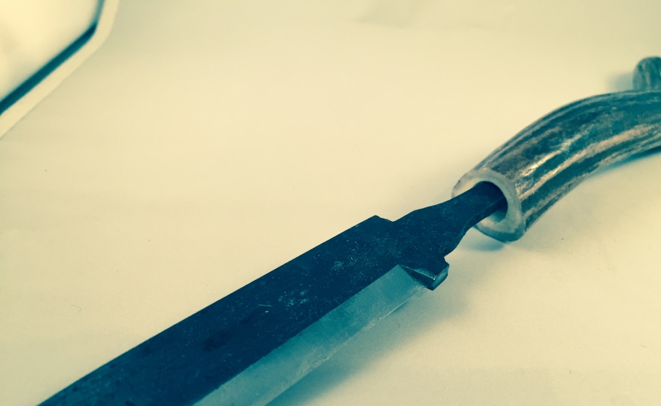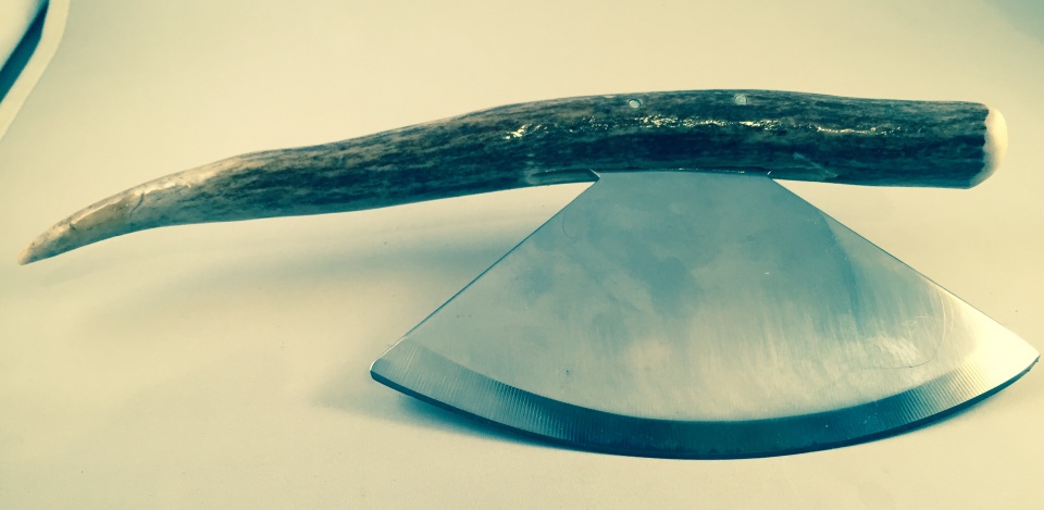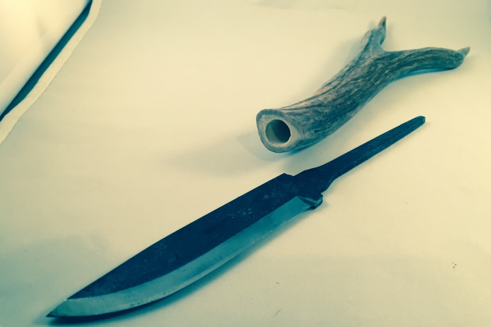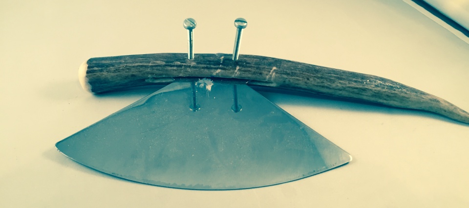 Can't see the other side of the stag handled Ulu, perhaps it has nuts on the other side? I think it would look great with brass or silver pins. You'll have to shape and sand the stag before final assembly.
