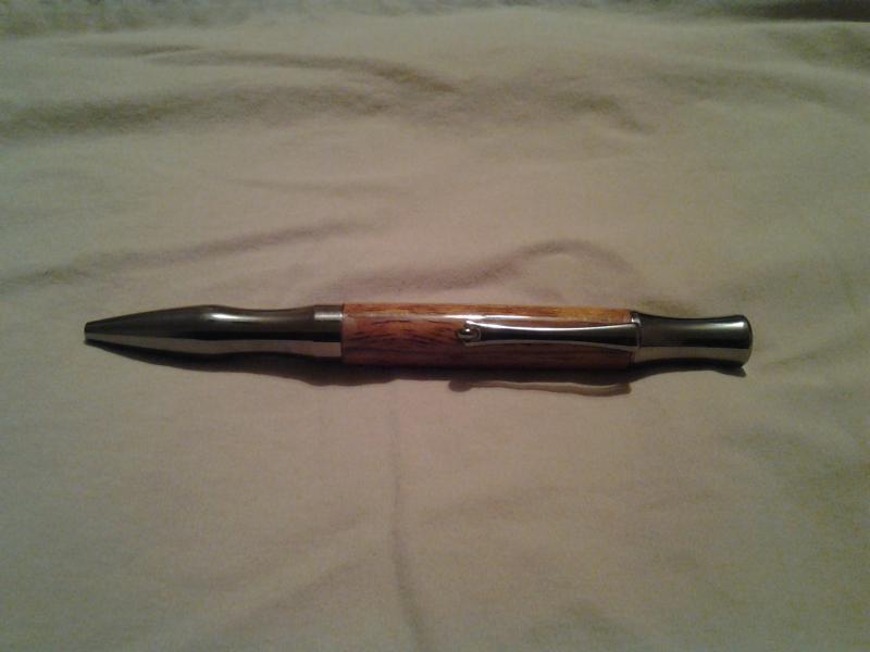 Well here is my second pen. It's a Princeton from woodcraft. I was happy with everything til I had to take the blank off the lathe. The bushings were glued to the blank lol so I tapped them on the edge of the work bench and then I was able to pull them off. Then on to the assembly. After scratching my head on how to put it together for about 30 min I finally did it and after looking at the pen I realized something went wrong when pressing everything together. If you didn't notice in the picture closes to the min it looks like the CA finished pulled apart from the wood. What did I do or not do lol?