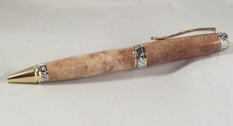So I go to my local wood butchers. www.turningblanks.net . One of the brothers hands me this chunk of wood. I ask, "What is it?" He says, "Quilted Sycamore Burl". Well, I got to be honest, it looked cool square, but it looks more cool round. Attached is the pen and a close up of the lower barrel. Comments welcome.