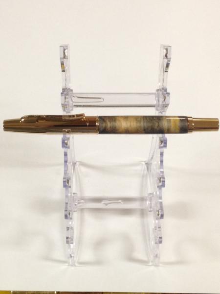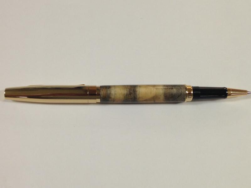 Here is a outright beauty that I received as an extra throw in junk piece in a shipment of Spalted Pear Root. It was a rough board end that had been horizontal cut. I saw the color variation and wondered "what would that look like turned down with CA finish." Now, I know! She is a beauty! But, I had to see what the pen turning masters thought of it.