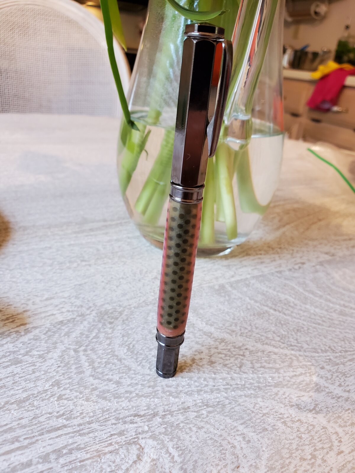 That's a pretty cool pen. I can see the blank is aptly named. I assume poxy = epoxy resin? As for selling, you will get a ton of different thoughts, but you'll have to consider your target customer.