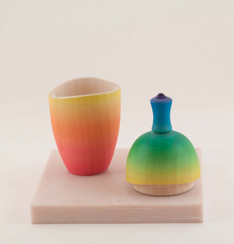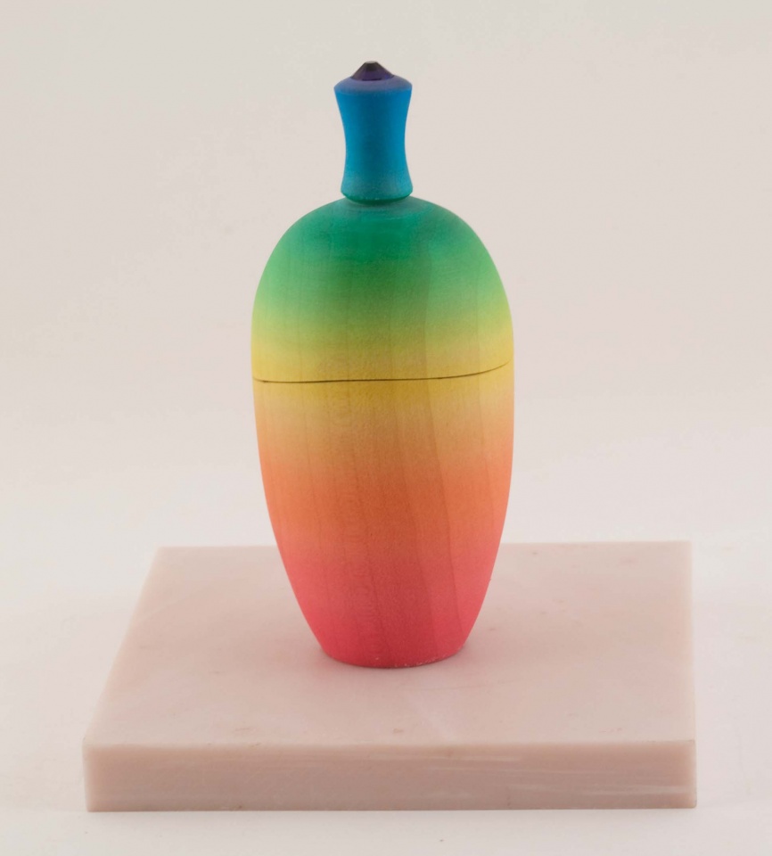 Bigleaf Maple Box with a wavy joint. Airbrushed with a Swarovski crystal inset in the finial. Around 4" (10 cm) tall.
