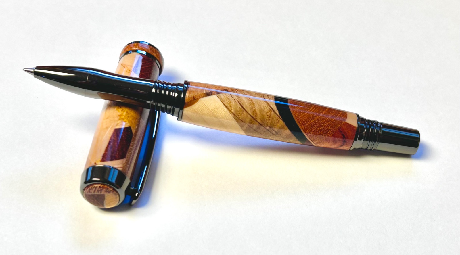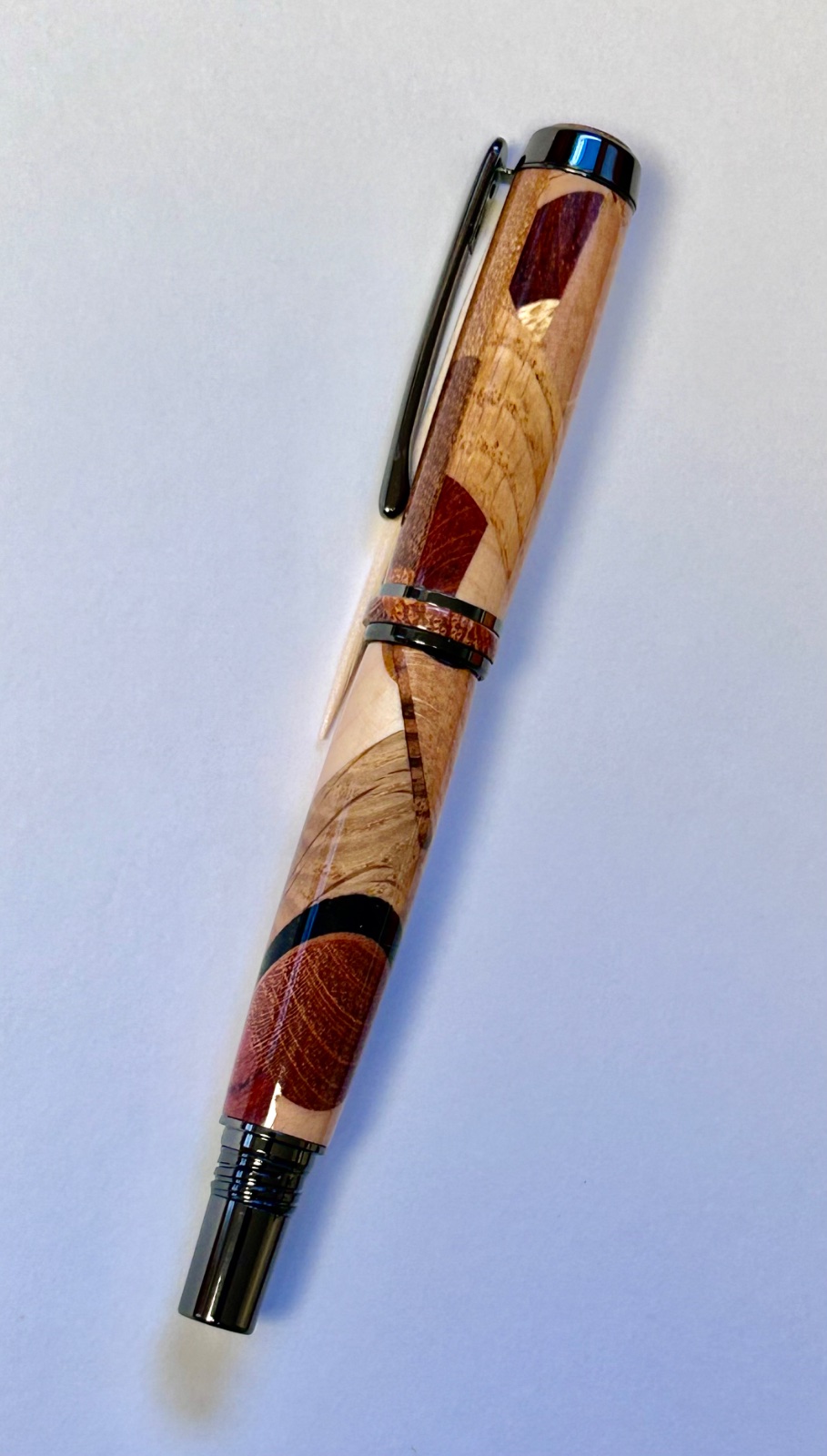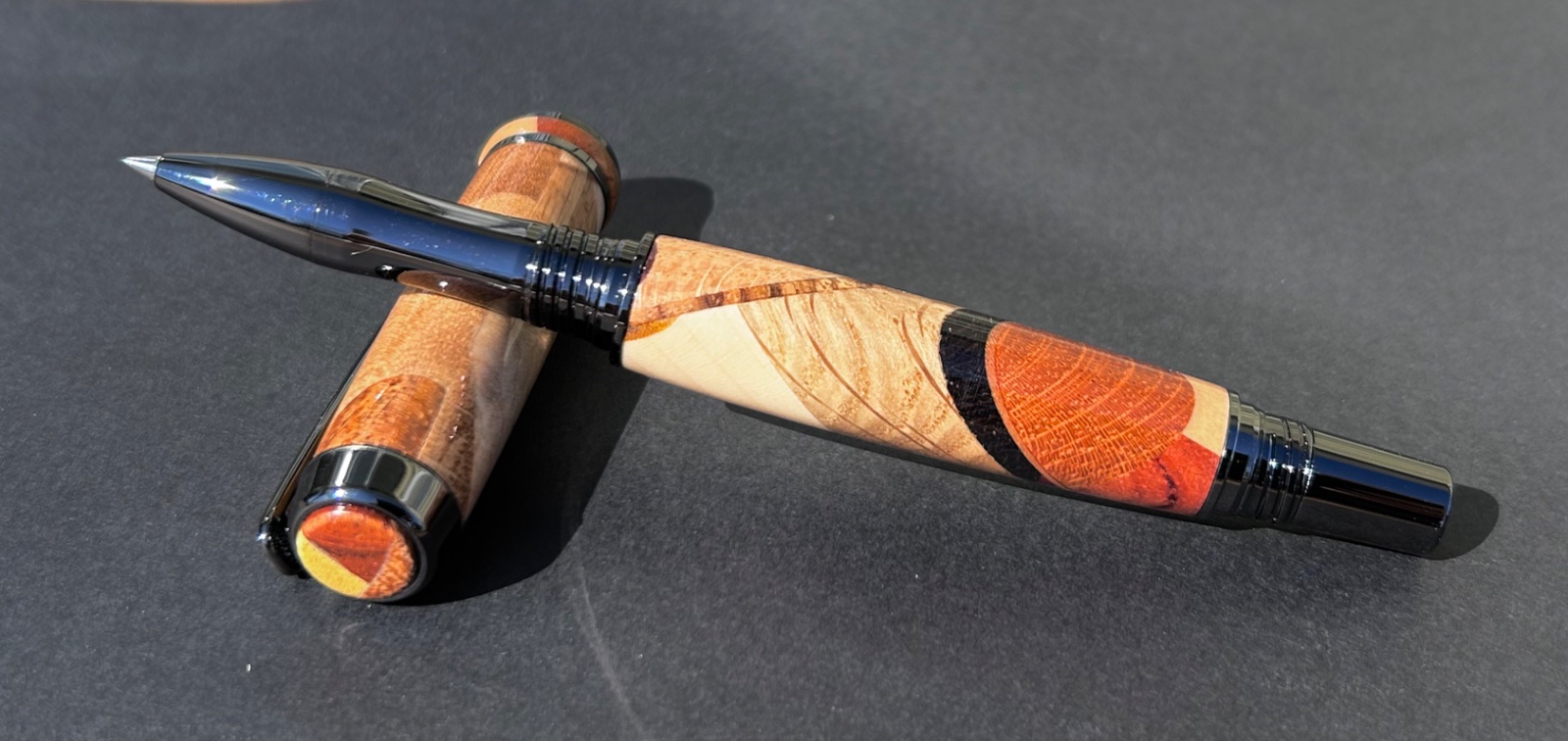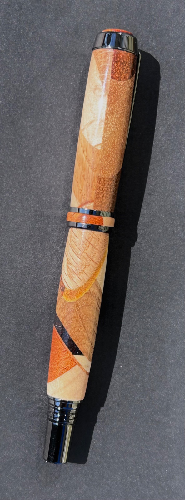 Random segments rollerball with custom finial and center band.