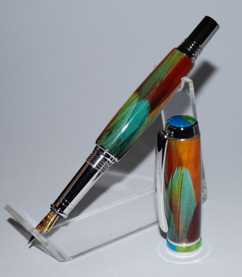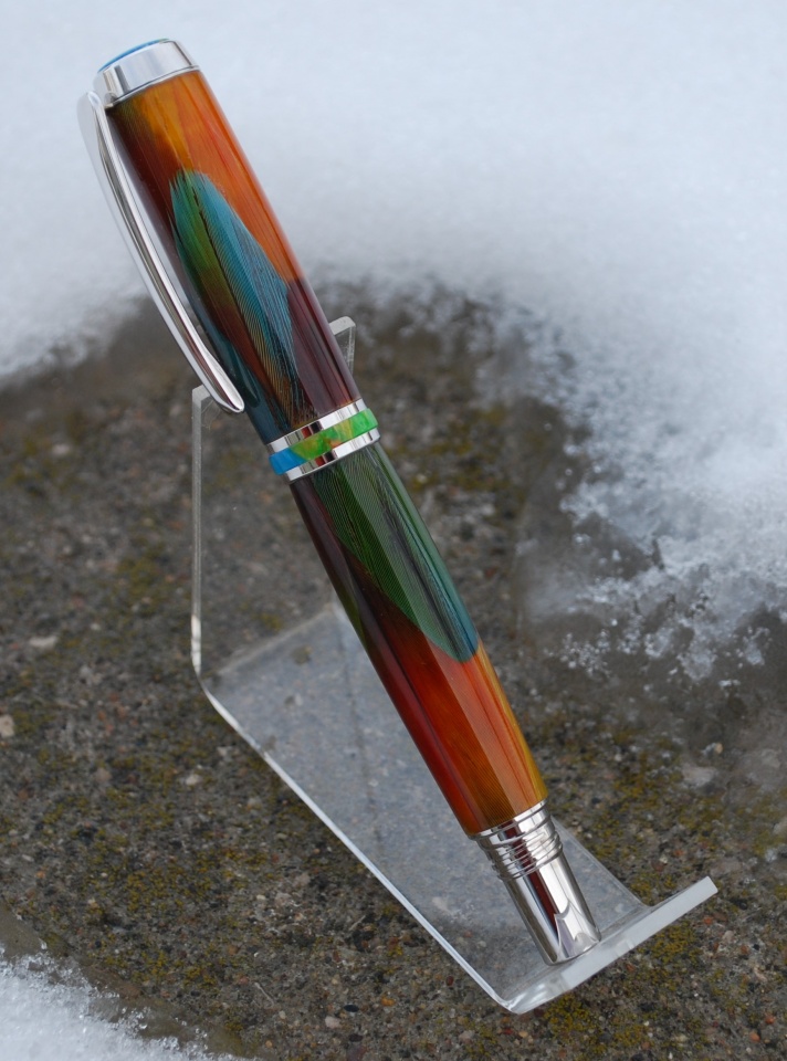 Macaw feathers are one of the most beautiful but also one of the most difficult to work with. I don't get many macaw feathers in but for the past few years I've been sorting out one here and there that has unique color or mixture of colors on a single feather. My thoughts were to save up until I had enough to make myself that special pen. Well, this year I decided to put my name in the PITH drawing. I've had lots of fun in the past and received beautiful works of art. So then it sets in... you read who you are paired up with and search his work here to see what he's made and shared. That added a higher level of stress. An Artist ! really ? I just take what mother nature made and cast it in resin. This man actually creates art! To say I was nervous is an understatement. I had to come up with something but felt it should be a feather pen, just not my typical feather pen. Something different or unique. That's when that little baggie of rare gems popped into my head. It was time to bring these little babies to life. I spent several hours arranging them on the tubes. After a couple days of drying they were cast in polyresin and set to cure for 18 hours. That's a long time to continuously hope they turn out. Turning them was no usual task either. I felt like it was the first pen I made, taking light touches, sharpening the skew every few minutes, and praying I didn't blow it up. lol
