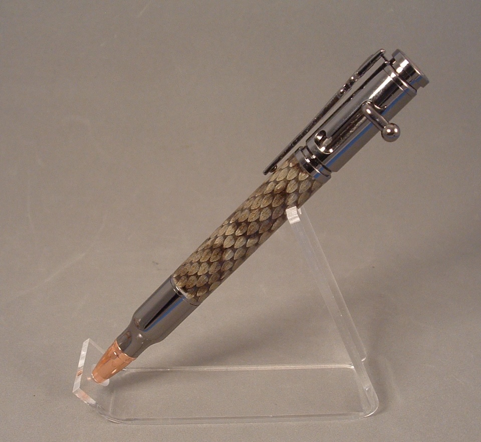 I was really impressed with the snakeskin blank from Don. I've had trouble finding really nice snakeskin blanks lately and was pleased to find an IAP member making great ones. A nice prairie rattlesnake combined with a gunmetal bolt action kit is one of my favorite pens to make and I'm just tickled to be able to make nice ones again.