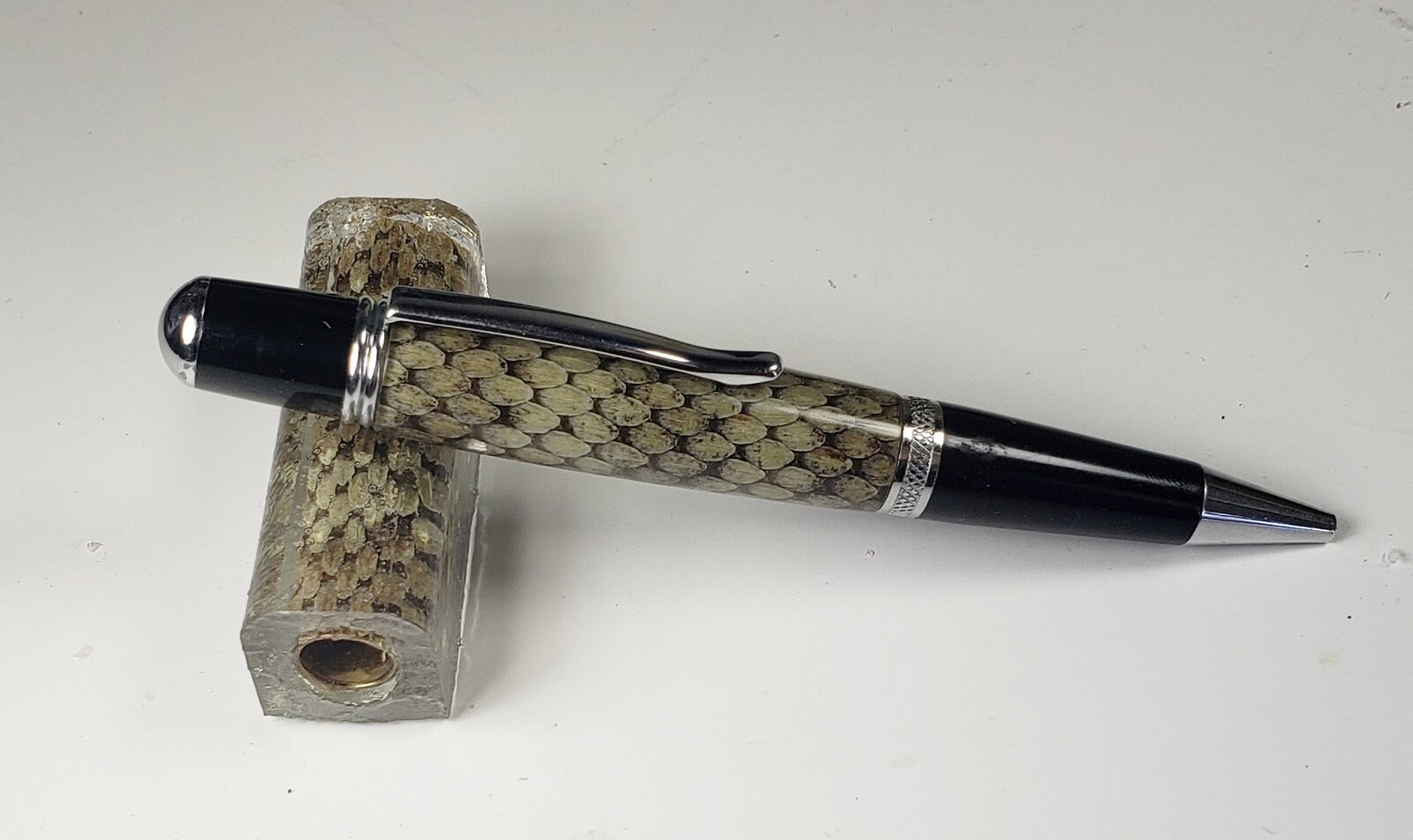 wolf creek knives Member Joined Dec 22, 2017 Messages 3,368 Location Ulm Montana Mar 21, 2021 #7 Nice looking pen Don. Best part about it is the snake skin is embedded in Acrylic and is dead. I HATE snakes!!! But they do make nice pens as witnessed here.