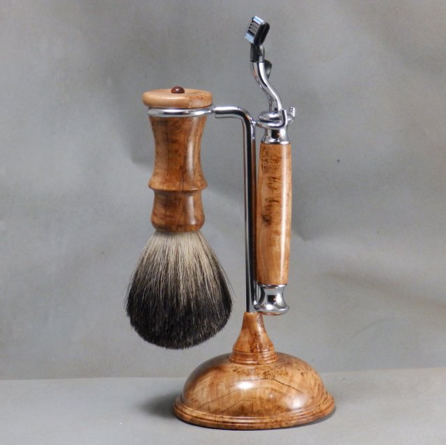 Mach 3 razor, brush and stand, in chrome. The stand broke off when I tried to screw it into the piece that presses into the base, so I improvised. Comments are welcome.