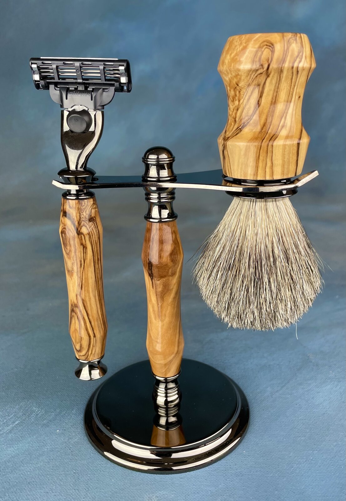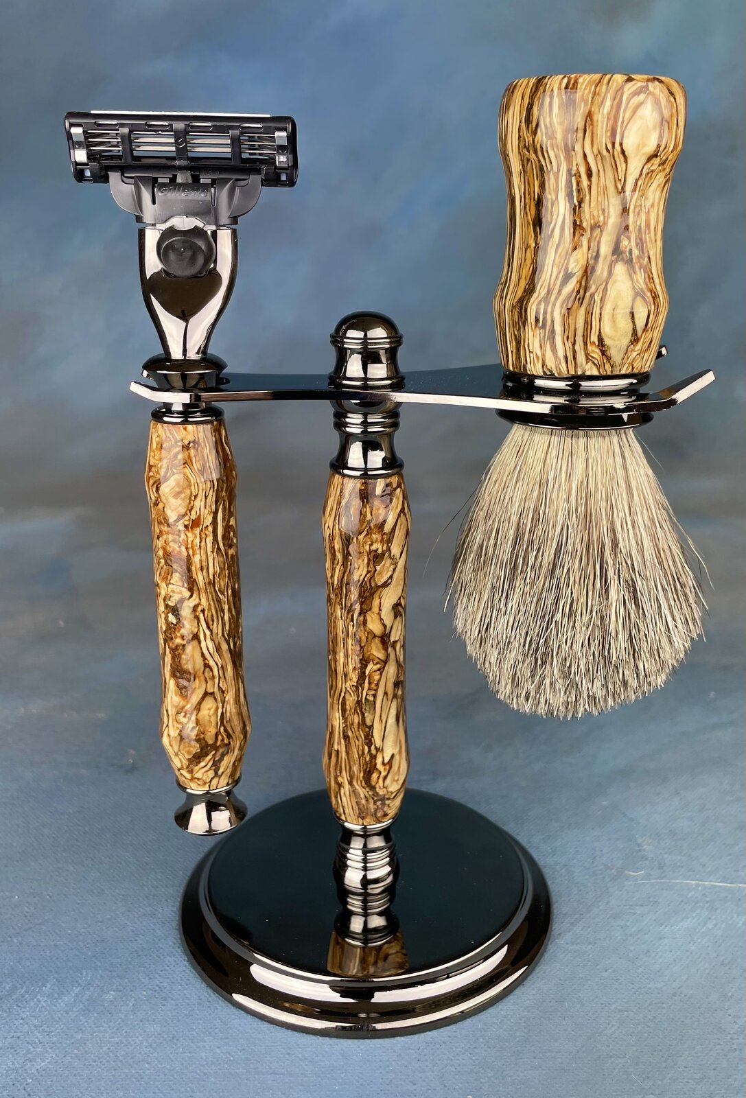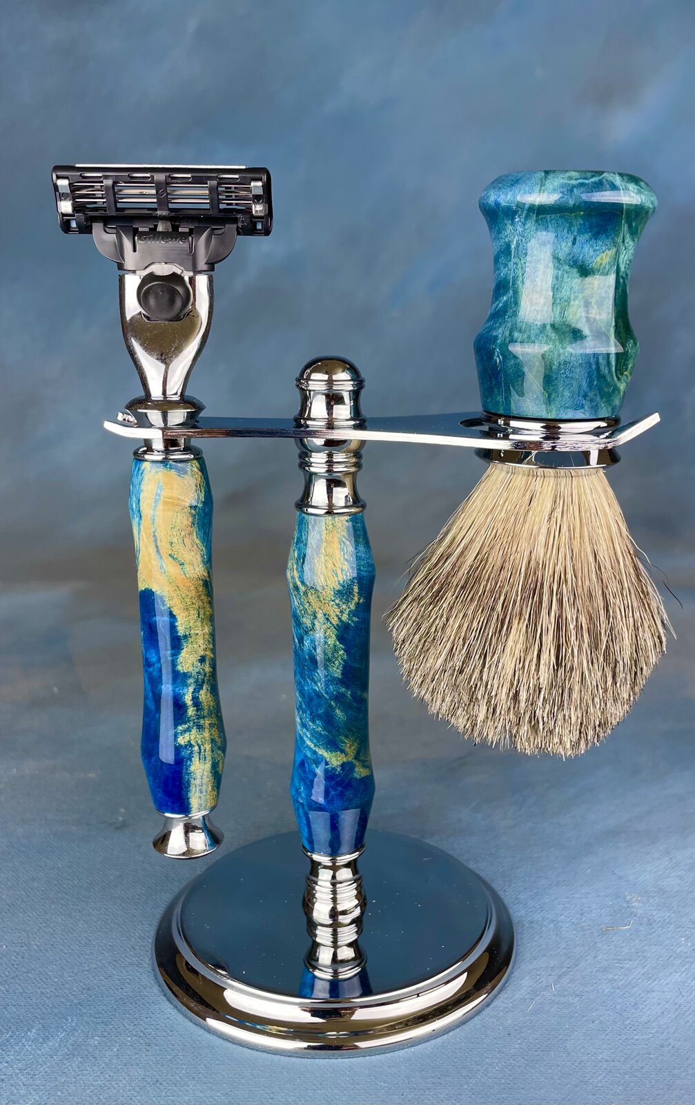 Here are today's efforts three Mach Three razor sets using exhibition Bethlehem olive wood, blue dyed box elder burl and hemp wood. All are very glossy as the lights were adjusted to reduce reflections. The hemp wood razor and stand were fairly straightforward though I was gentle in my passes. The shave brush was an issue as it split off a fairly large chunk partway through turning. I glued it back using thick CA let it dry and used several coats of thin CA to toughen everything up. Well, it worked but I left the shape less than my usual idea and took a win. Use fresh carbide and NOT sharpened ones and hemp wood can be in your sales.