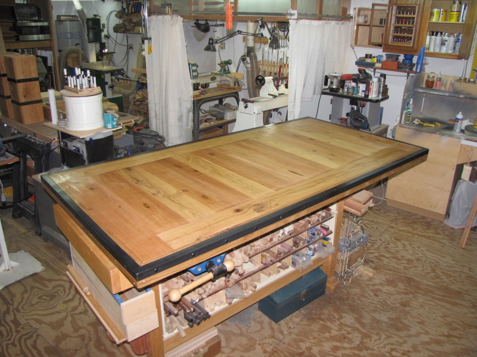 New dinner table for my Sister. Delivered for a 4th of July Family get-together. The wood materials are 100% re-purposed and 90-95% re-claimed. The reclaimed wood is mostly Oak with a little bit of Pine(the table feet). The Oak and Pine are reclaimed from the renovation of a covered bridge located in Otway, Ohio. For additional details of the construction check out J&J WoodSmithing on Facebook(see my signature block). The back banding around the top and the legs is 1-1/2" steel angle iron around the table and 1-1/2" steel banding on the legs.